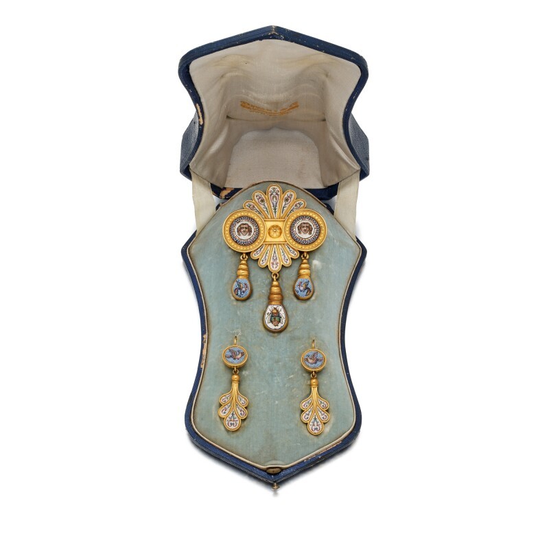 A Gold and Micromosaic Brooch and Pair of Earrings, retailed by Tiffany & Co., of Archaeological Revival design featuring micromosaics in wirework frames, the brooch with round plaques depicting Classical theatre masks, palmette-shaped plaques with foliate motifs and drops depicting a scarab and a pair of birds, the earrings with tops depicting birds suspending foliate motif drops, with Vatican workshop marks; circa 1860s. With fitted box from Tiffany & Co.