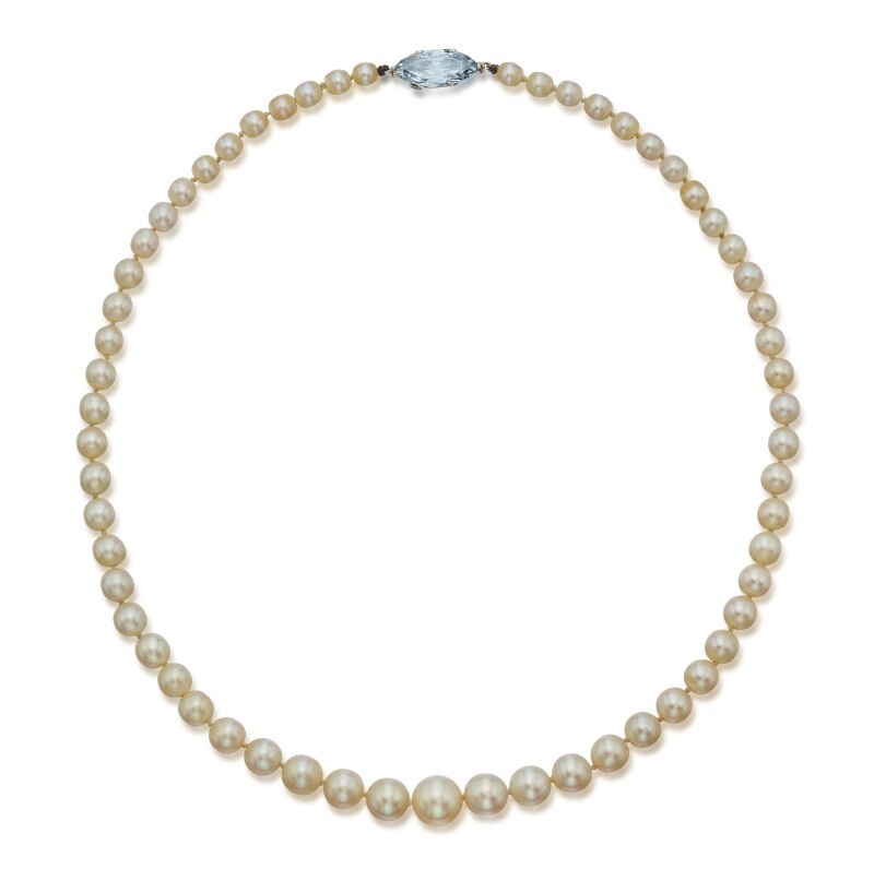 A Natural Pearl and Fancy Blue Diamond Necklace, composed of 59 graduated round to near-round natural pearls, completed by a clasp set with a marquise-shaped Fancy Blue diamond weighing 3.78 carats.