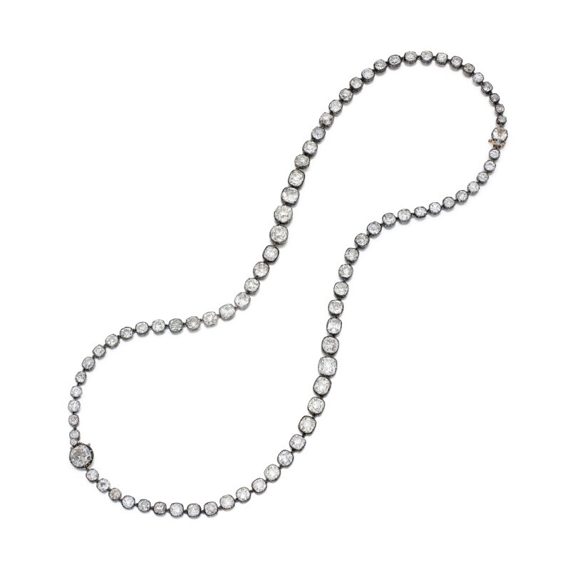 Two Impressive Diamond Necklaces, each designed as a line of graduating old mine-cut diamonds in collet settings, lengths approximately 17¼ inches and 15¼ inches, attachable for wear as one long necklace, with extra diamond links measuring approximately 4¼ inches.