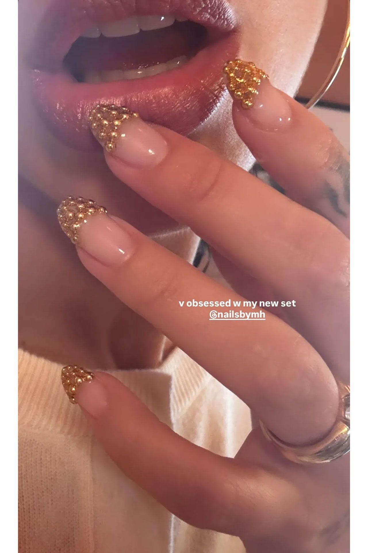“I used different-sized golden micro flat-back beads,” Humphrey tells Allure. “These were individually placed using a jewellery gel and manicure stick and cured into place. The beads are larger in size towards the smile line and taper in various sizes towards the tip of the nail, building up that gilded look.”