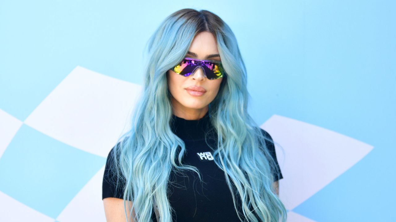 For this more colourful take on Megan Fox, “I used Aprés Gel-X Sculpted Coffin Medium Tips and their airbrush machine to create the perfect aura effect,” Boyce said. “The studs were sealed in with Orly Builder in a Bottle and finished with the Orly No Cleanse Topcoat for a clean, glassy finish.”