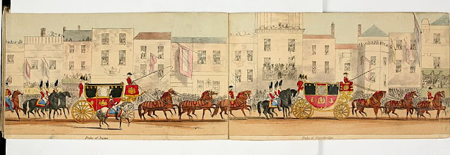 | Part of the procession, from a long “tableau” print, by Robert Tyas, the carriages of the queen’s uncles, the royal dukes of Sussex and Cambridge. Image from Wikimedia Commons |
