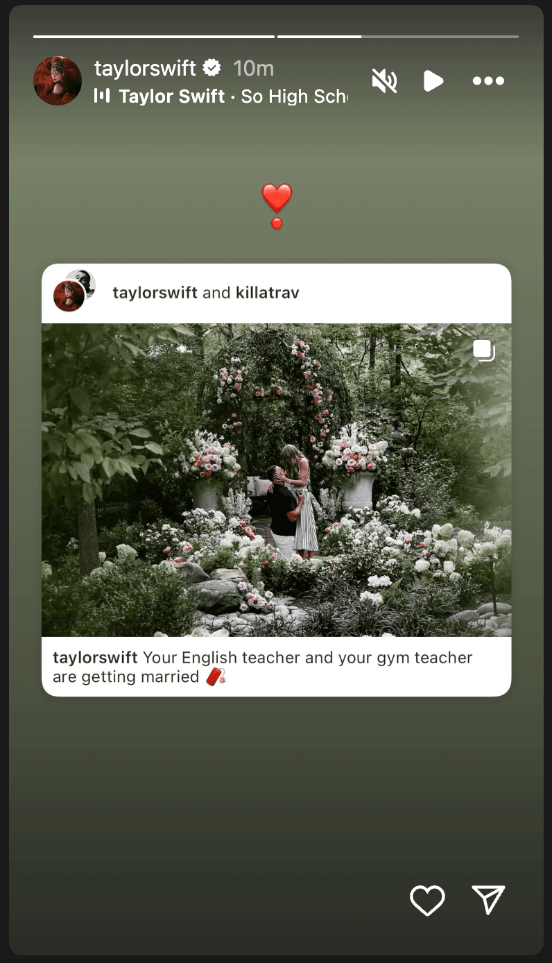 Okay, on New Heights, Taylor talked about Travis’ grand romantic overture being the kind of thing she’d “Been writing songs about wanting to happen to me since I was a teenager.” Then, in their announcement, the caption read, “Your English teacher and your gym teacher are getting married 🧨.” Taylor posted it to her Stories along with a red heart emoji and her song “so high school,” which is famously about Travis (“You know how to ball, I know Aristotle”) and how he makes her feel like a teenager back in high school.