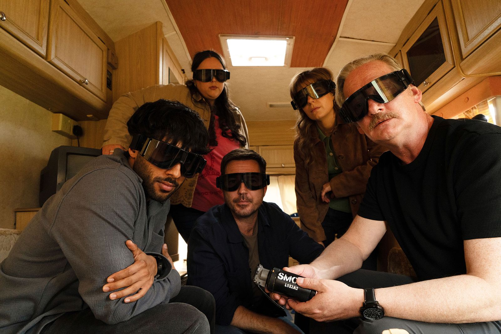 Image may contain Chaneil Kular Martin Compston AimeeFfion Edwards Rae Earl Accessories Sunglasses Face and Head
