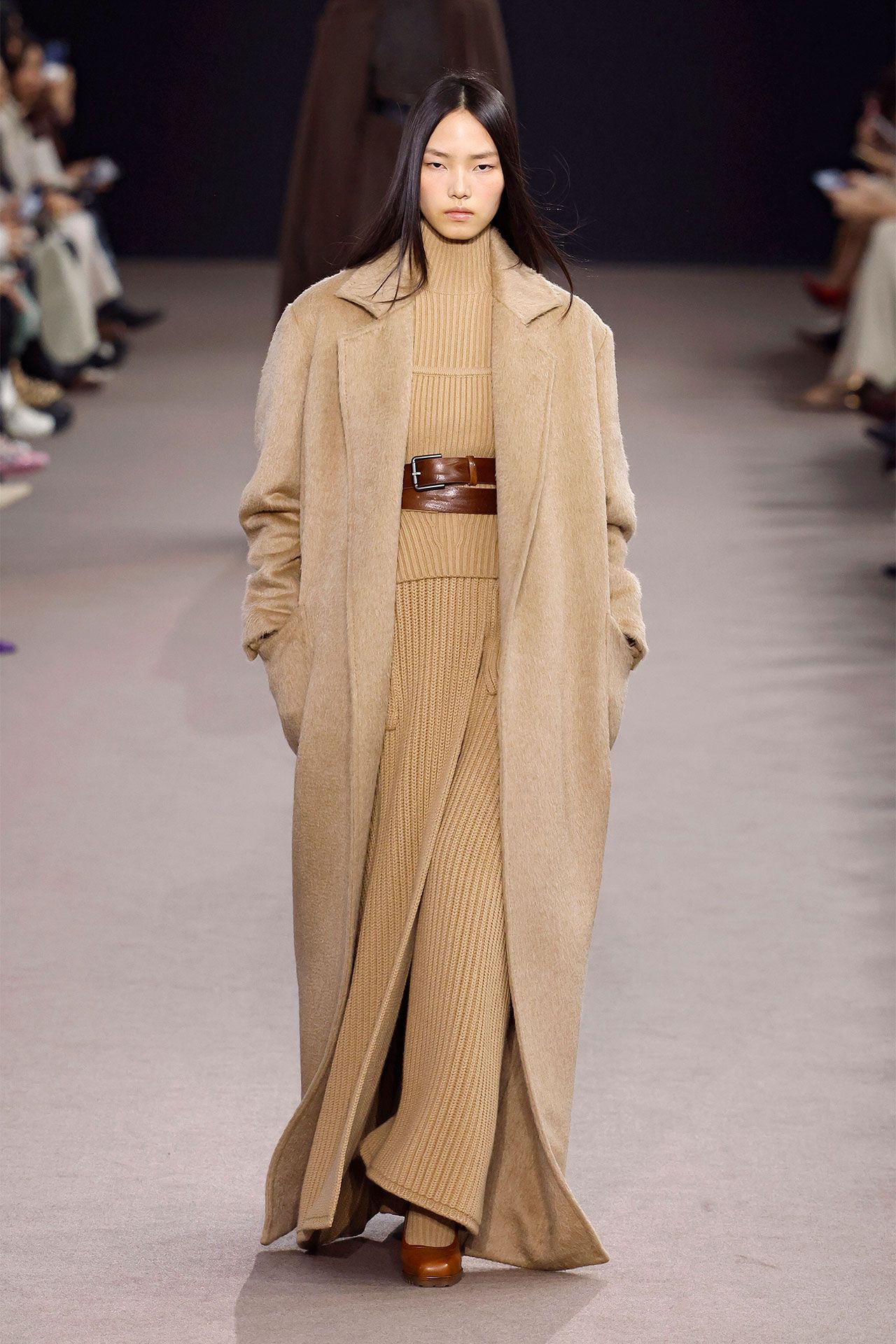 Of course, you can’t mention the words camel and coat without thinking of one brand in particular: Max Mara. From its signature teddy coats to the Manuela Icon design (a Meghan Markle favourite) Max Mara is an expert in the field of caramel-hued winter coats and has the quiet luxury category on lock down. And in Milan this season, the Italian fashion house put floor-sweeping camel coats worn with monochromatic ensembles down the runway – mixing the luxe texture of the coat with ribbed knitwear and leather belts (the double belt trick is one to try).