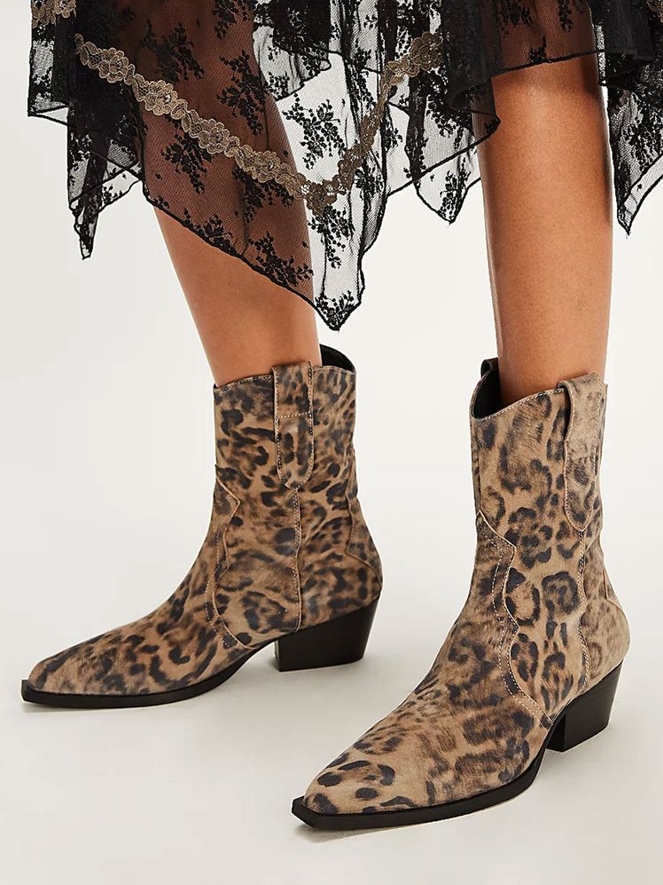 The ankle boots from Free People are a perfect example of elegant western boots: the heel and silhouette pick up on typical western elements, but the height of the shaft and the trendy leopard print make them look much more modern. They go well with jeans, a maxi dress or a combination of a mini dress and blazer.