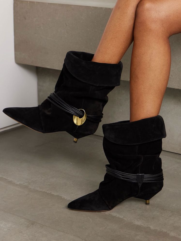 Slouchy ankle boots are best combined with mini dresses or shorts, which gives them enough room to unfold their full effect. Isabel Marant provides the perfect model for autumn: the suede boots have a loosely falling shaft that is folded over at the top. In combination with the tiny heel and leather ties, they look relaxed and stylish at the same time.