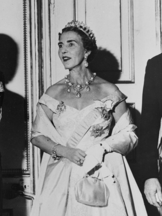 Queen Ingrid wore the Khedive of Egypt Tiara and the Diamond Earrings and Brooch suspended from the Danish Diamond Rivière.