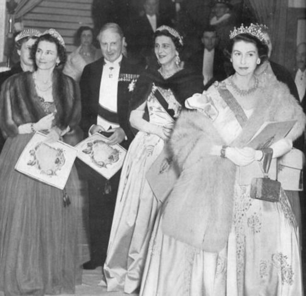 The following evening, King George VI and Queen Elizabeth (wearing the Oriental Circlet Tiara and Queen Victoria’s Crown Ruby Parure) joined President and Madame Auriol for a glittering Gala Performance at the Royal Opera House in Covent Garden, alongside Princess Elizabeth (wearing the Girls of Great Britain and Ireland Tiara and her City of London Fringe Necklace), the Duke and Duchess of Gloucester (in the Gloucester Honeysuckle Tiara), the Duchess of Kent (wearing the Kent City of London Fringe Tiara), Princess Mary, Countess of Harewood (in her Fringe Tiara), Lady Patricia Ramsay (wearing her Diamond Tiara), the Earl and Princess Alice, Countess of Athlone (in her Diamond Palmette Tiara), Princess Marie Louise (in the Cartier India Tiara), the Marquess and Marchioness of Carisbrooke (wearing the Teck Ears of Wheat Tiara)