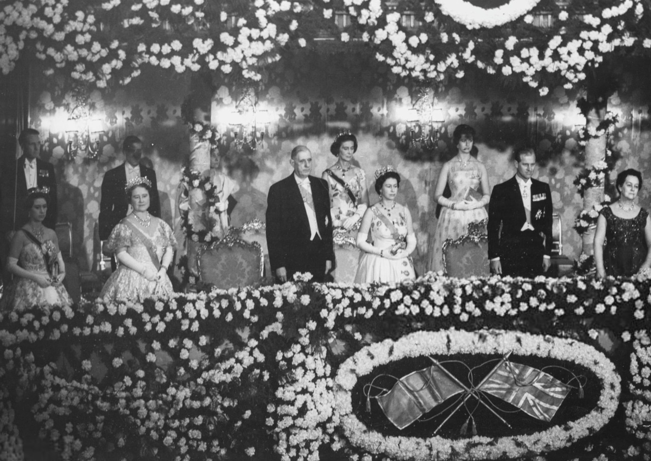 On the final evening of the State Visit, the Queen (wearing Queen Alexandra’s Kokoshnik Tiara), Duke of Edinburgh, Princess Margaret (in the Cartier Halo Tiara), Antony Armstrong Jones, Princess Marina, Duchess of Kent (wearing the Kent City of London Fringe Tiara), and Princess Alexandra were pictured attending the Return Banquet hosted by President and Madame de Gaulle at the French Embassy in London.