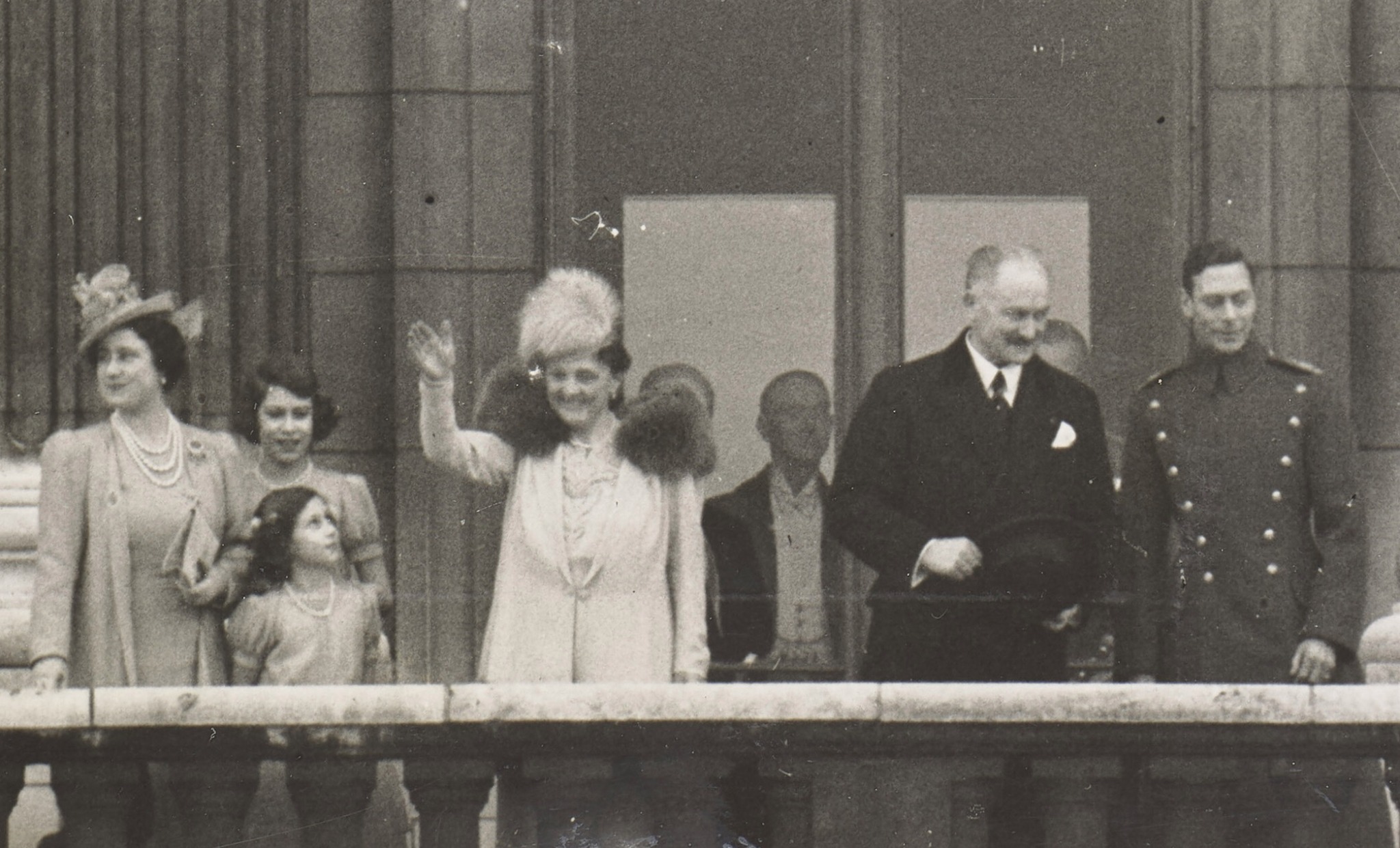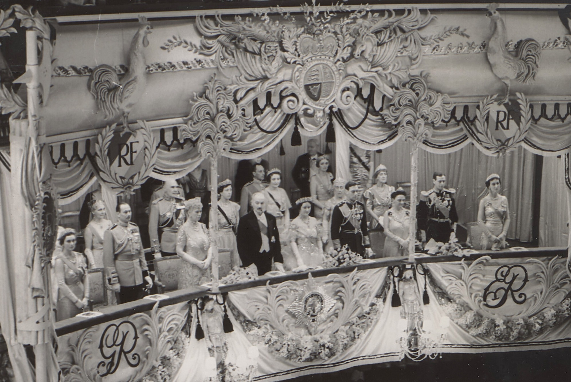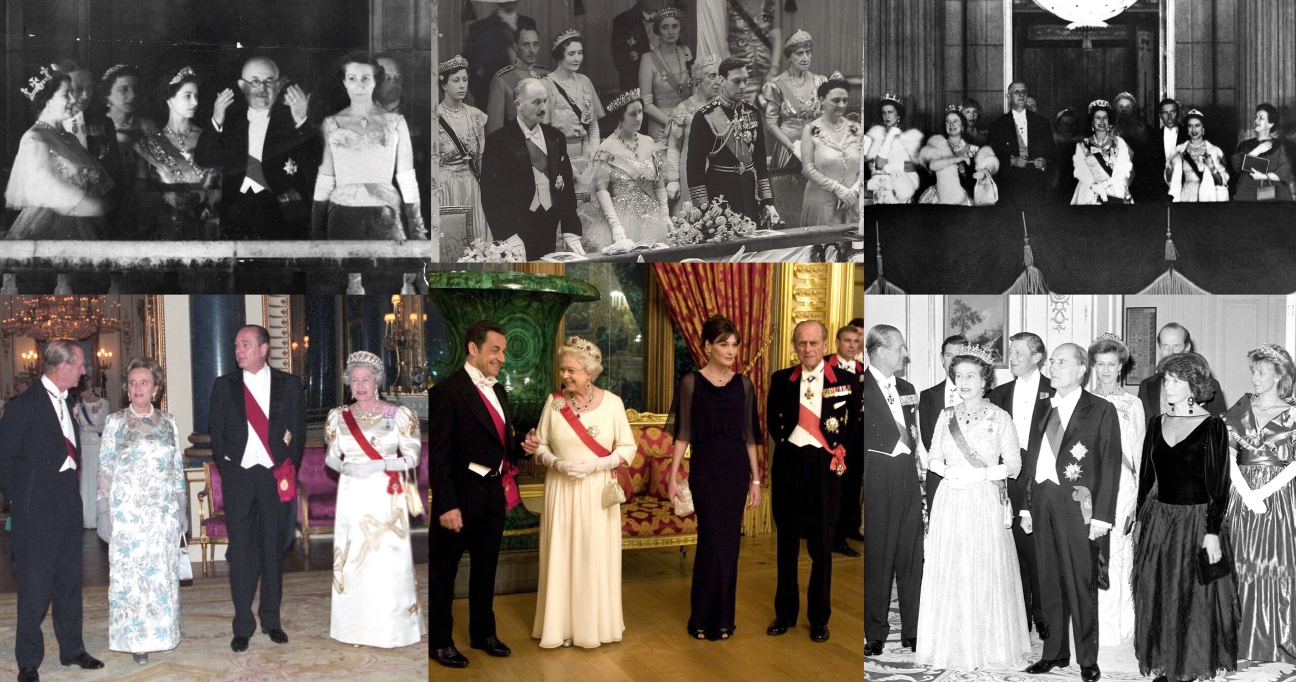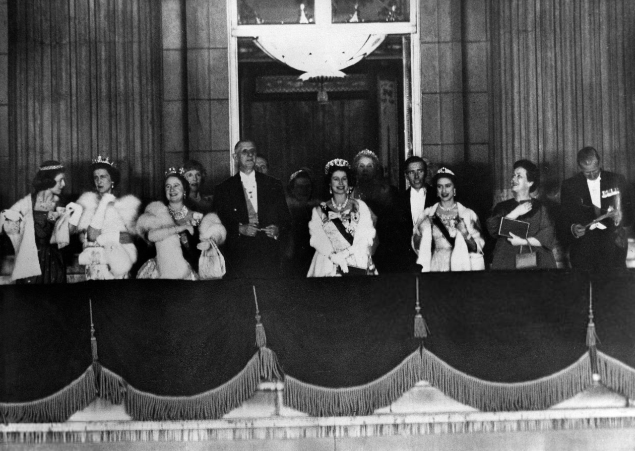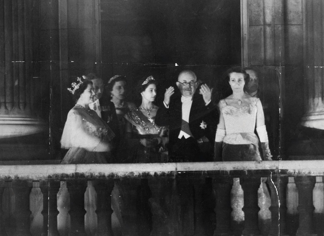 The British Royal Family hosted French President Vincent Auriol and Madame Auriol on their State Visit to the United Kingdom in 1950, with King George VI and Queen Elizabeth (wearing her Crown) holding a spectacular State Banquet in honour of President Vincent Auriol and Madame Auriol, following which the party viewed fireworks from the Balcony of Buckingham Palace, joined by Princess Elizabeth (in the Nizam of Hyderabad Tiara), the Duke of Gloucester, and Princess Marina, Duchess of Kent (wearing the Kent Pearl Bandeau).