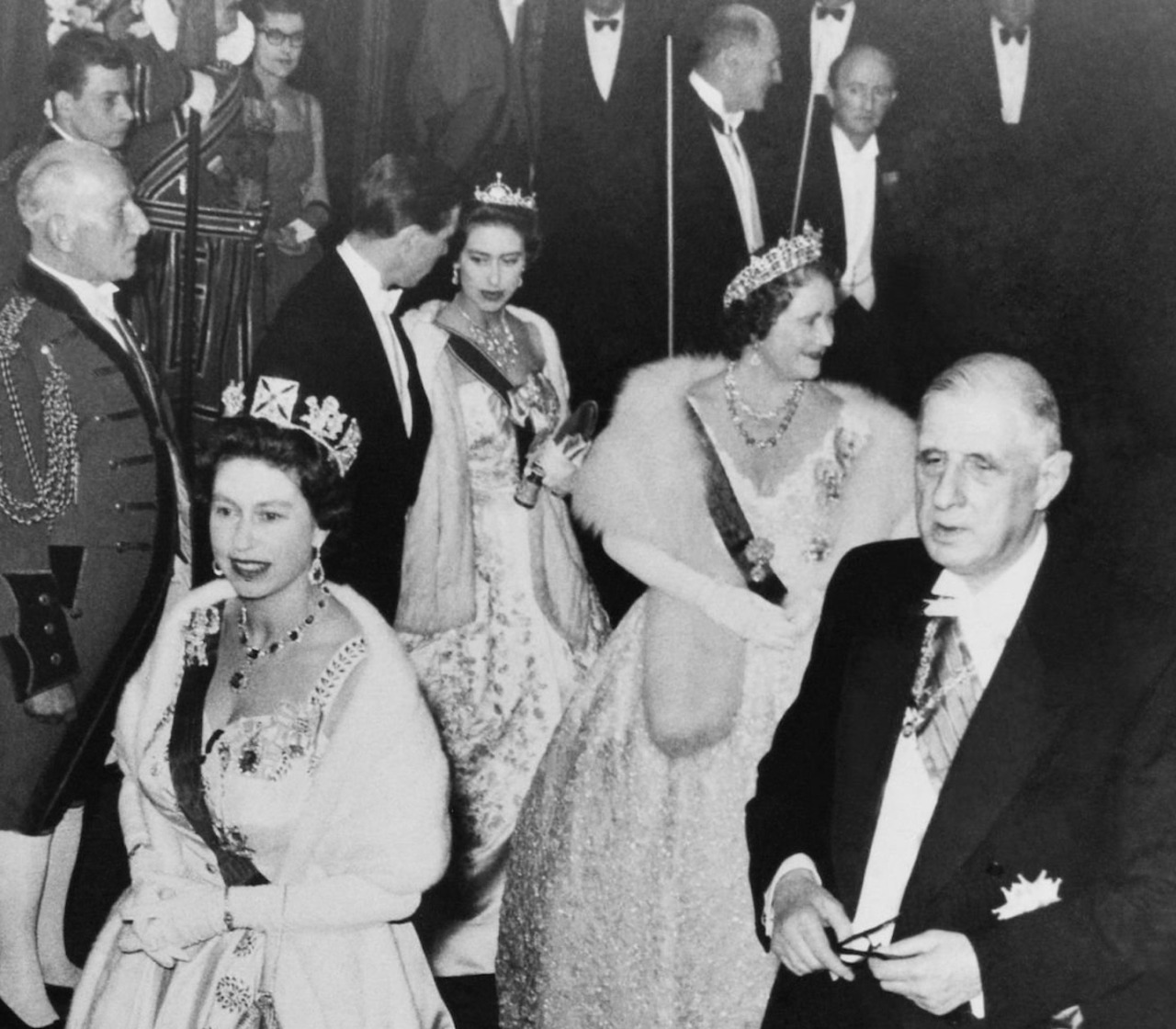 The following evening, the Queen wearing the George IV State Diadem with the King George VI Sapphire Suite), President de Gaulle, the Duke of Edinburgh, Madame de Gaulle, and Queen Elizabeth, the Queen Mother (in the Greville Tiara) attended a glittering Gala Performance at the Royal Opera House in Covent Garden. Other royal attendees included Princess Margaret (wearing the Lotus Flower Tiara), Antony Armstrong-Jones, the Duke and Duchess of Gloucester (in the Teck Turquoise Tiara and Parure), the Duchess of Kent (wearing the Cambridge Sapphire Parure), and Princess Alexandra (in Queen Mary’s Crochet Bandeau).