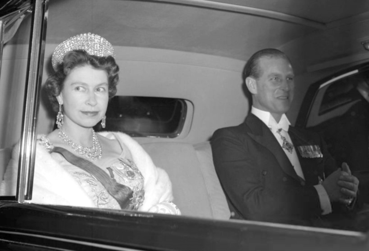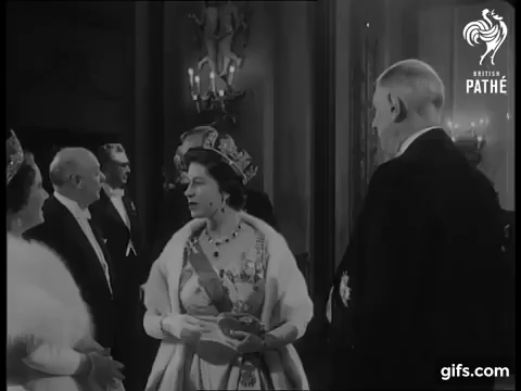 The Queen and Duke of Edinburgh hosted President and Madame de Gaulle on their State Visit to Britain in 1960, with the Queen (wearing the Vladimir Tiara) holding a State Banquet at the Palace, which was followed by fireworks from the balcony, joined by other members of the Royal Family, including the Queen Mother (wearing the base of her Crown), Princess Margaret (wearing Marie Feodorovna’s Sapphire Bandeau), the Duchess of Gloucester (in the Teck Turquoise Tiara), the Duchess of Kent (wearing her Kent Festoon Tiara) and Princess Alexandra (in the Kent Circles Tiara), Lady Patricia Ramsay (in her Diamond Tiara), and Lord Mountbatten. An incident from the Banquet: