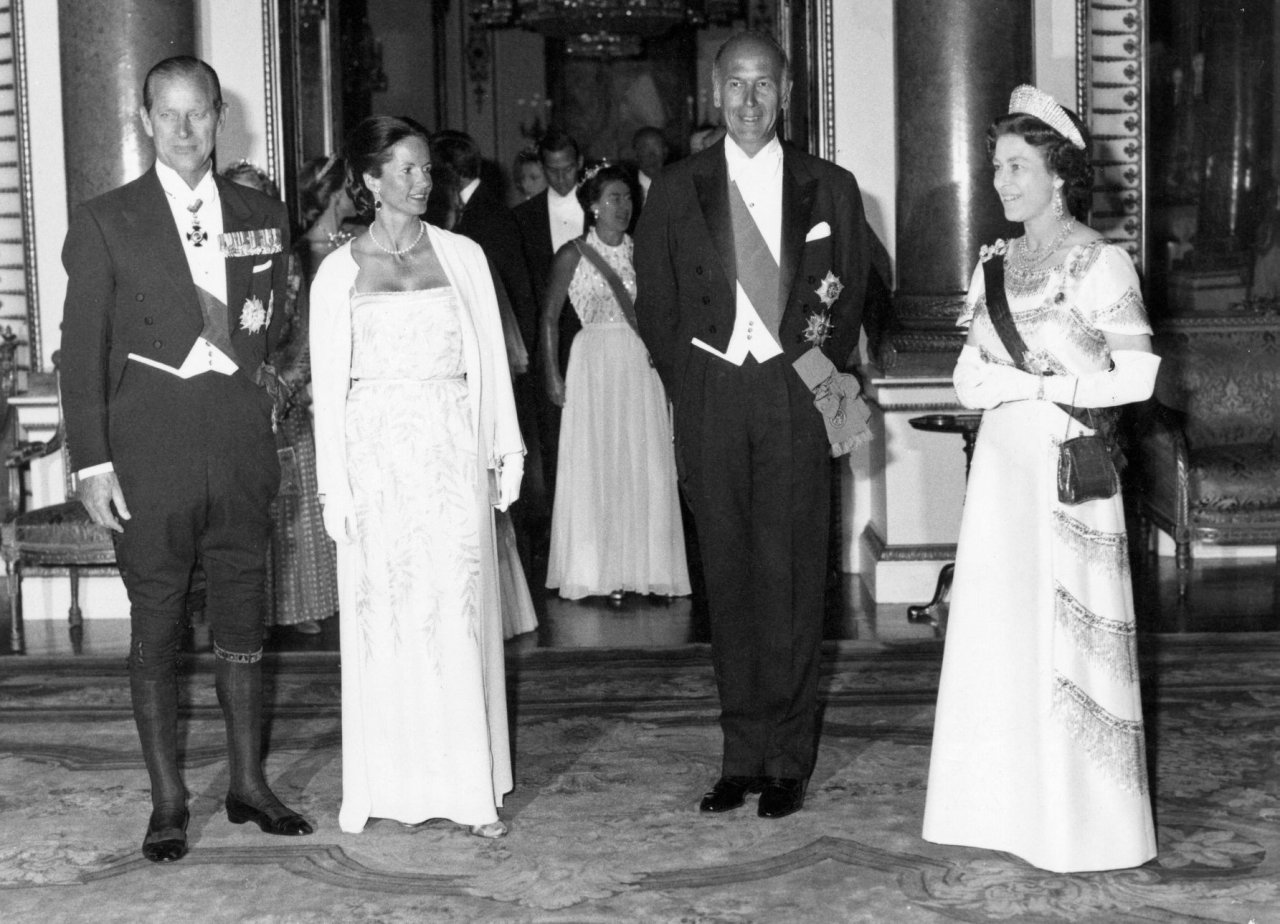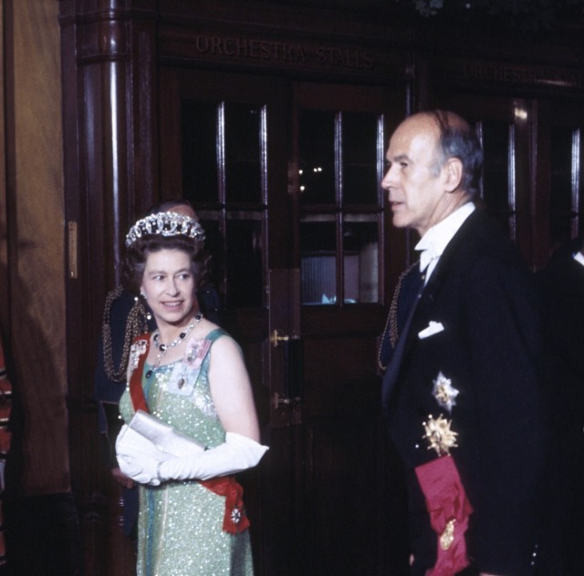 The British Royal Family host French President Valéry Giscard d’Estaing and Madame Anne-Aymone Giscard d’Estaing on this State Visit to Britain in 1976, with a State Banquet at Buckingham Palace held by the Queen (wearing Queen Alexandra’s Kokoshnik Tiara) with the Queen Mother, (wearing the Greville Tiara), Princess Margaret (wearing the Lotus Flower Tiara), Princess Alice, Duchess of Gloucester (wearing the Gloucester Honeysuckle Tiara), the Duchess of Kent (wearing the Kent Crochet Bandeau) and Prince Michael of Kent.