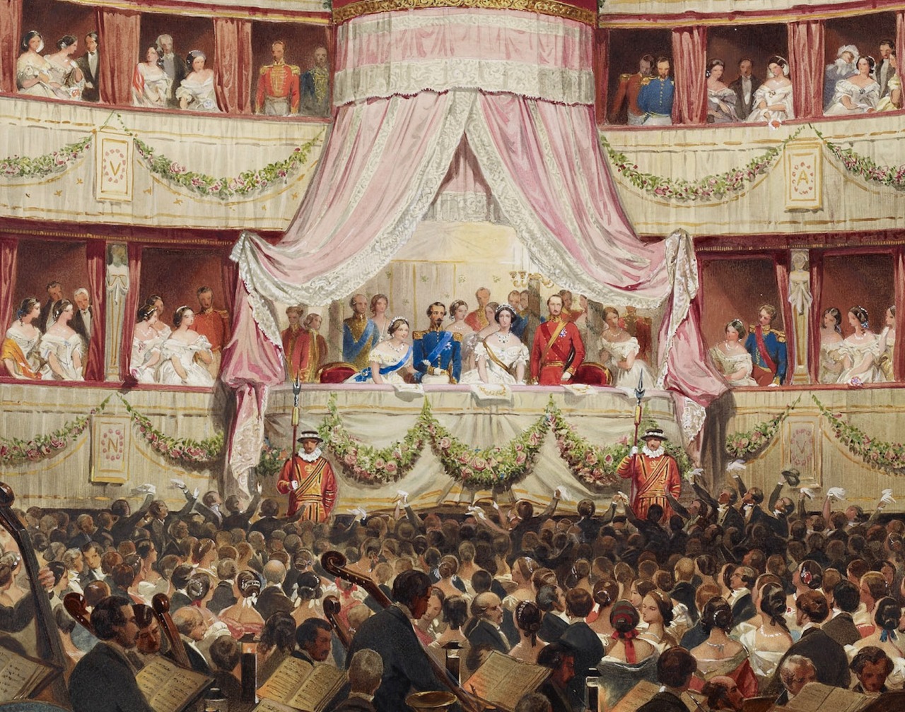 Queen Victoria and Prince Albert hosted Emperor Napoleon III and Empress Eugenie of France at Windsor Castle in 1855, with a Ball at Windsor Castle, a Gala Performance at Covent Garden, a Concert at Buckingham Palace, as well as a the Investiture of the Emperor by Queen Victoria (wearing her Regal Circlet) into the Most Noble Order of the Garter, while the Prince Consort, Empress (in her Pearl Tiara), Prince of Wales, and Princess Victoria watched.