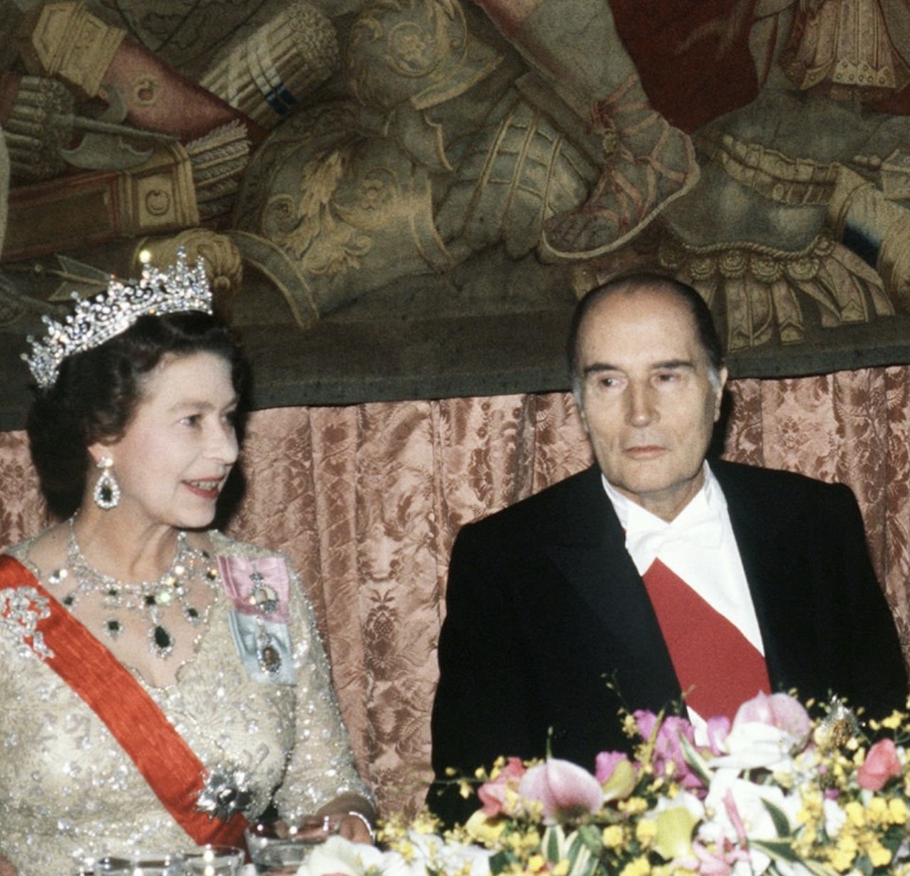 President Mitterrand also held a Return Banquet for the Queen (wearing the Girls of Great Britain and Ireland Tiara and the Godman Emerald Necklace) and Royal Family, including the Duke and Duchess of Gloucester (in the Gloucester Honeysuckle Tiara), Duke of Kent, Princess Alexandra (in the Ogilvy Tiara) and Sir Angus.