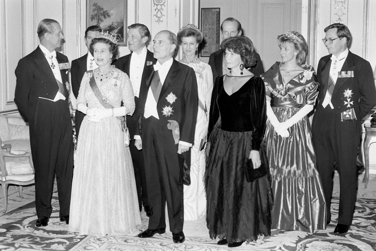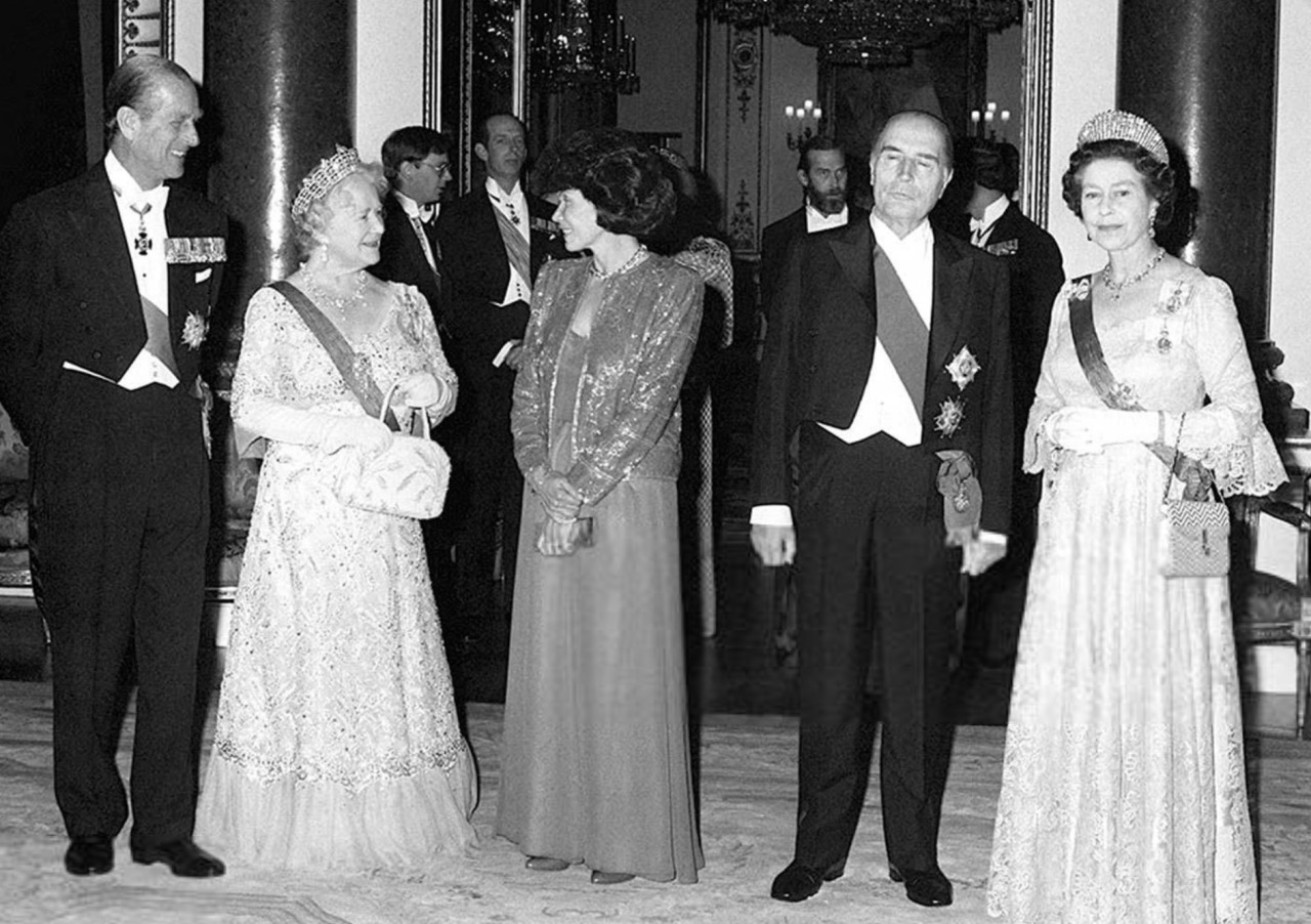 The Royal Family also received President and Madame Mitterrand on their State Visit in 1984, with a State Banquet held by the Queen (wearing Queen Alexandra’s Kokoshnik Tiara), Duke of Edinburgh, Queen Mother, (wearing the Greville Tiara) and extended Royal Family at Buckingham Palace.