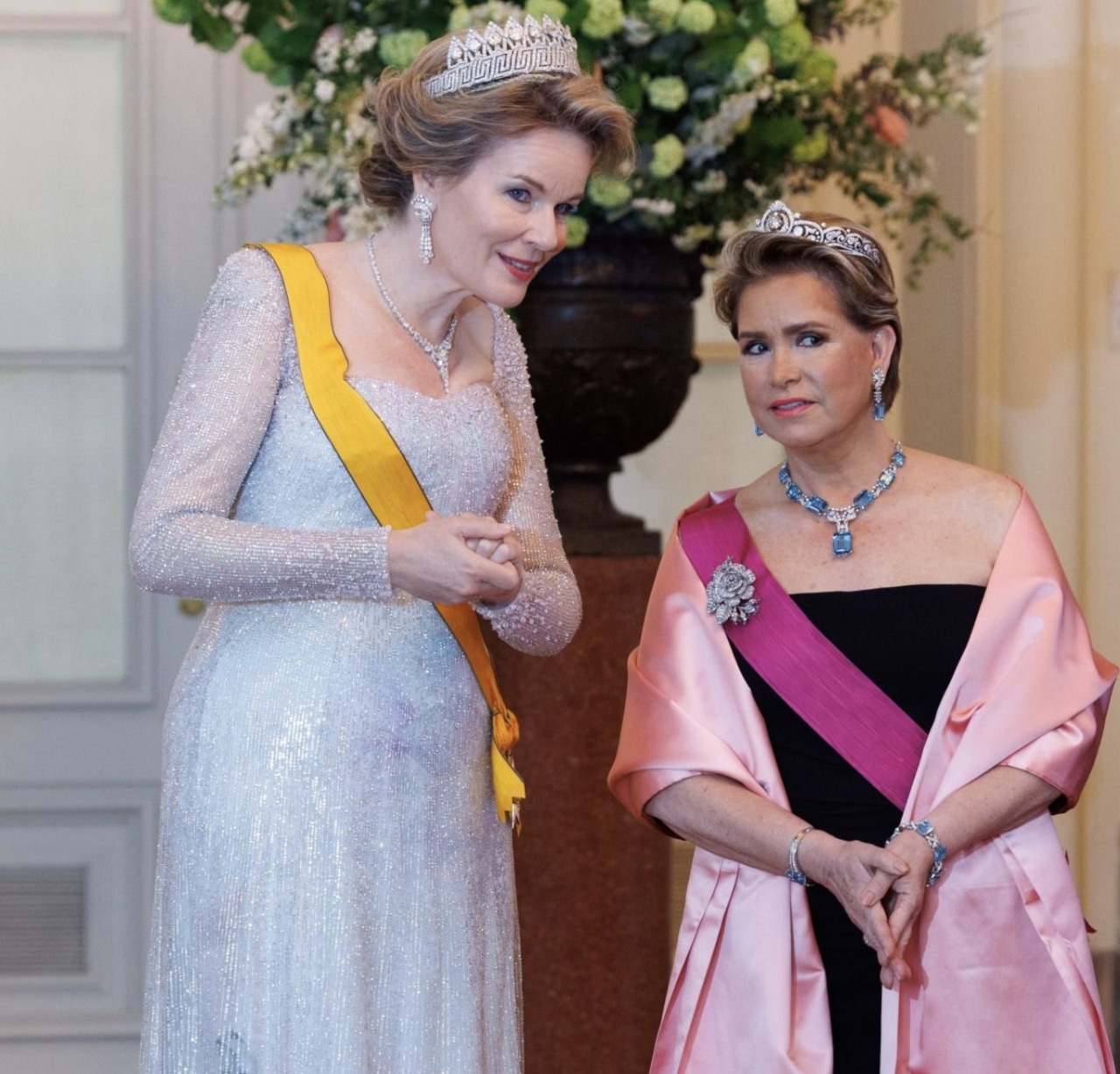 For the Dutch State Visit to Luxembourg, Grand Duchess Maria Teresa wore the Belgian Scroll Tiara, Queen Maxima was in the Stuart Diamond Tiara, and Hereditary Grand Duchess Stéphanie wore the Chaumet Choker Tiara.