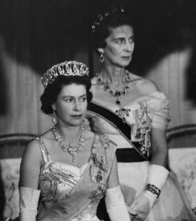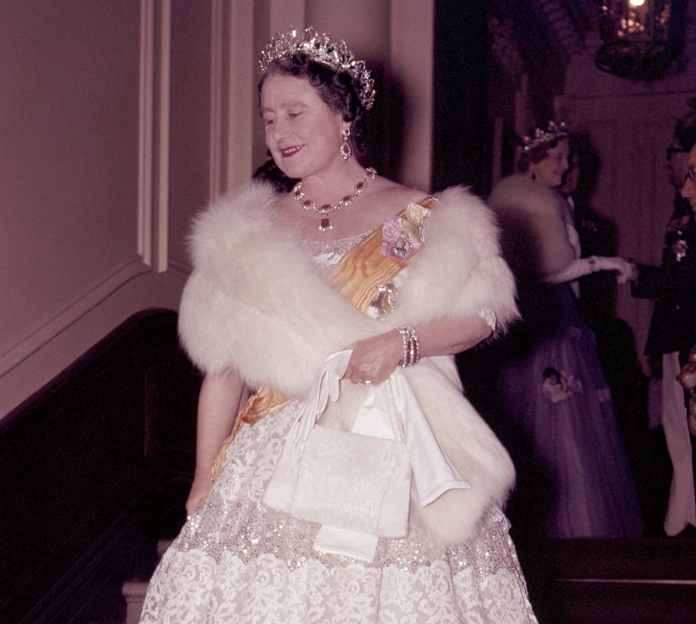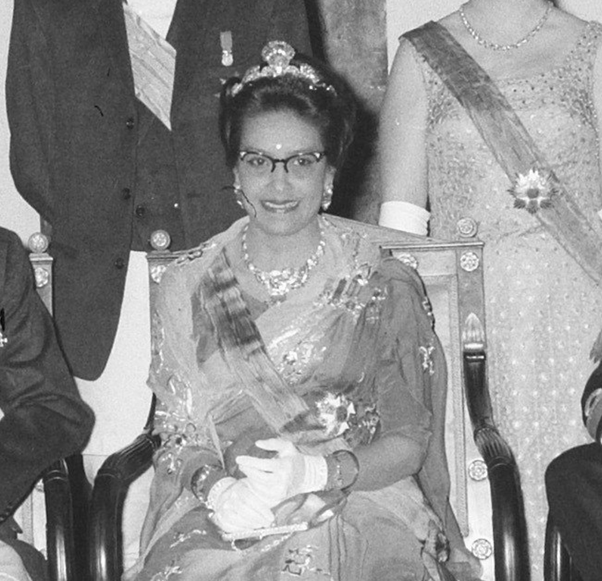 The Queen Mother wore the Oriental Circlet Tiara and Crown Ruby Parure with the Order of Ojaswi Rajanya.