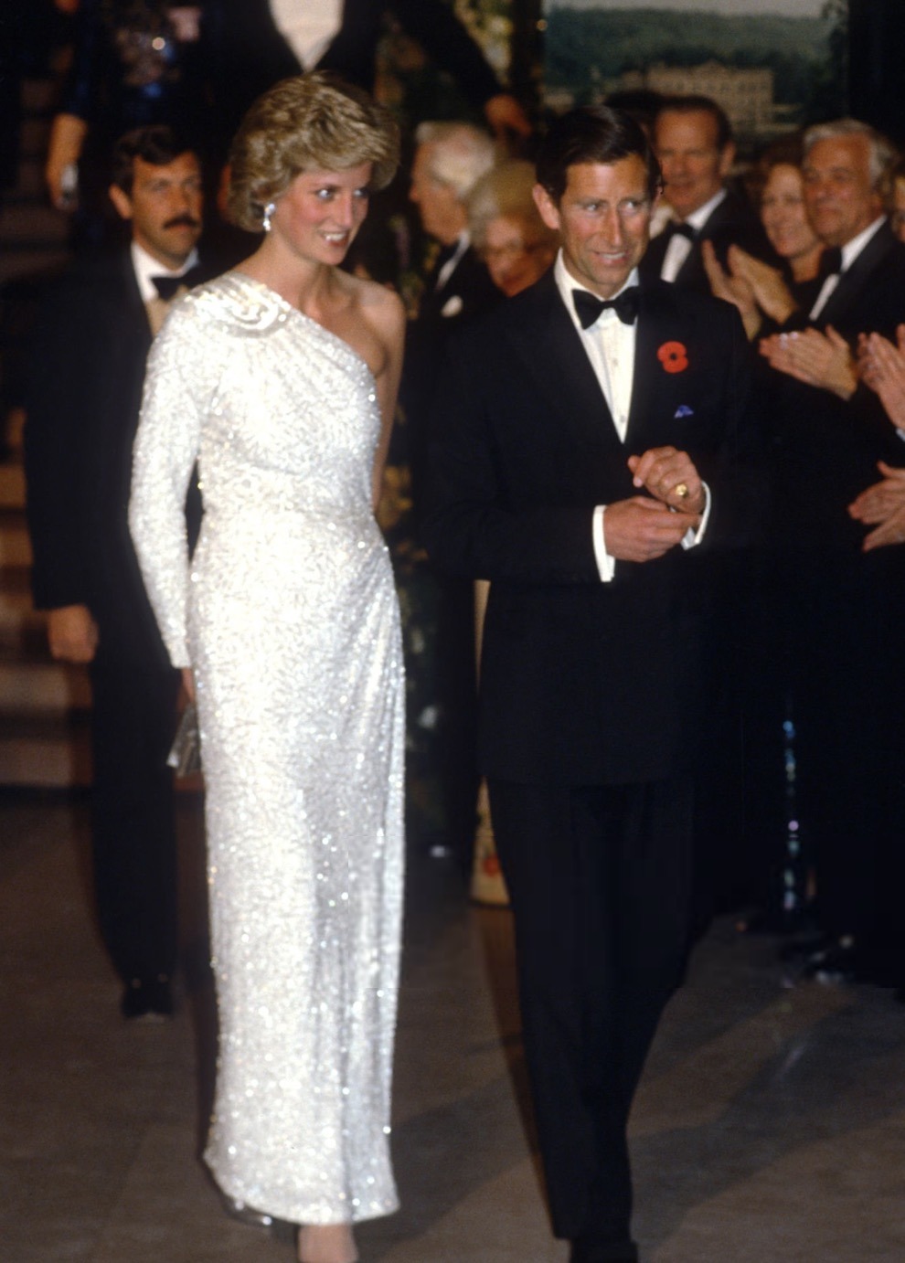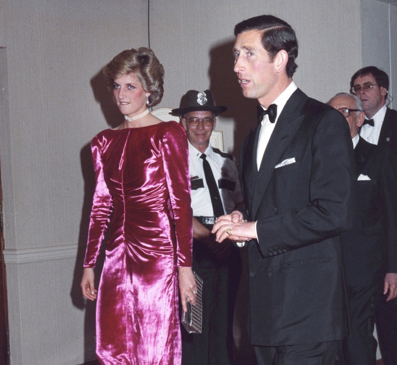On their final evening in the United States, the Prince and Princess of Wales (wearing her Spencer Choker) attended a Charity Dinner in Aid of United World Collages in Miami, with many celebrities, including Joan Collins and Zsa Zsa Gabor.