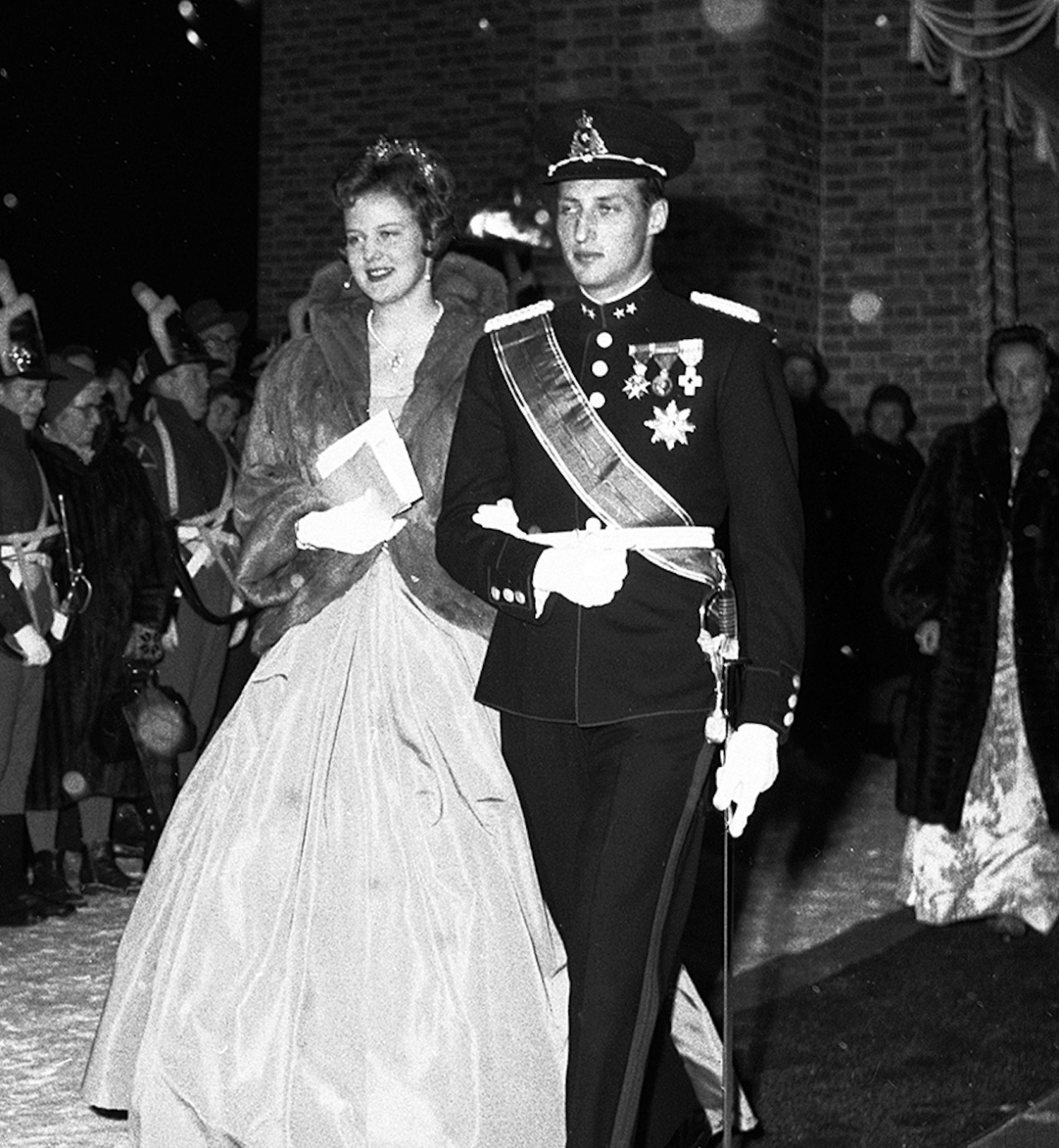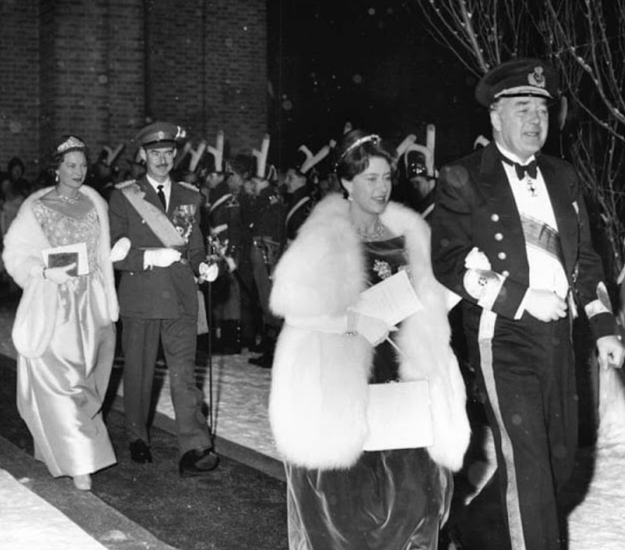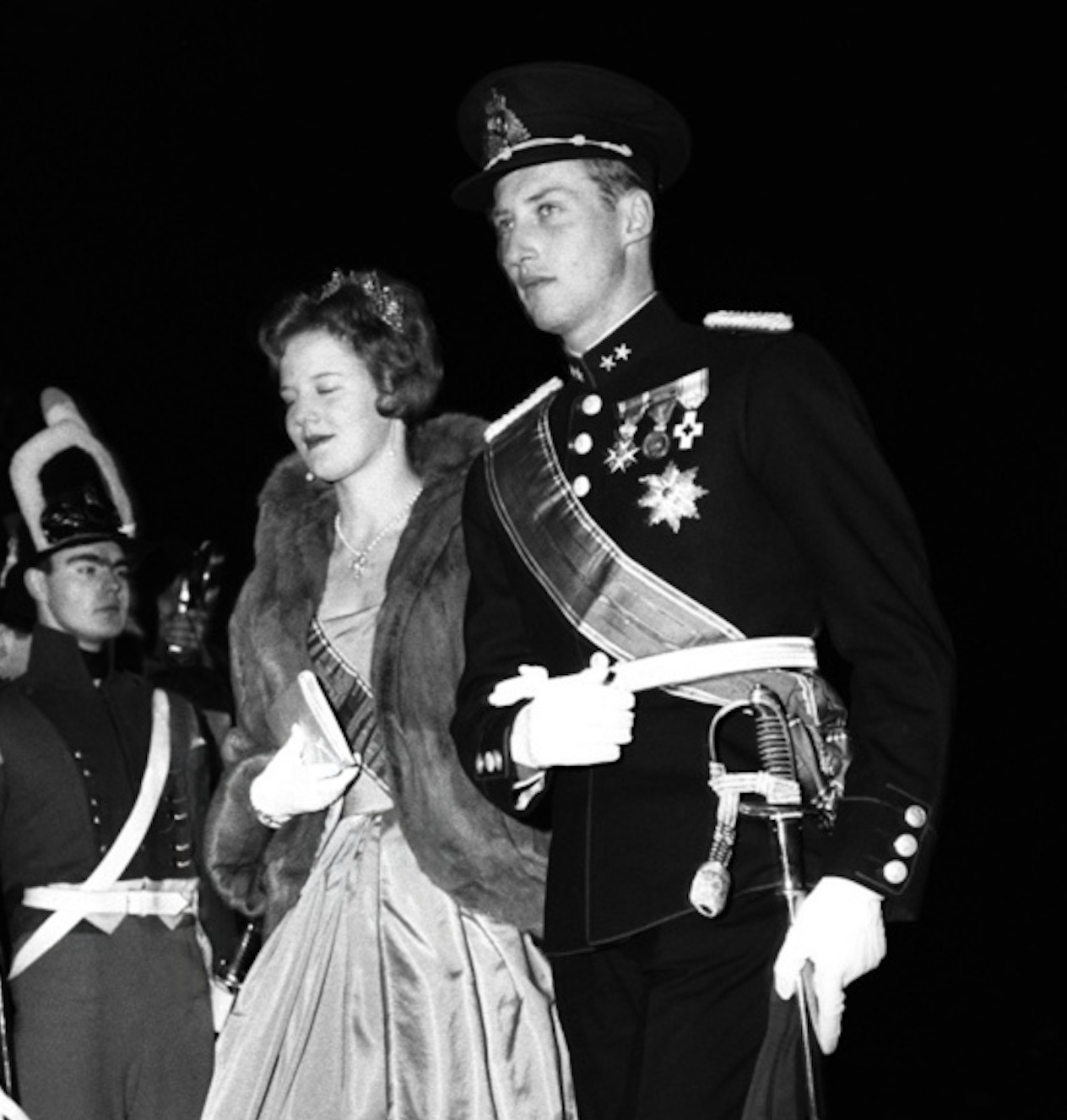 Crown Prince Harald of Norway (brother) and Princess Margrethe of Denmark (distant cousin, wearing Queen Alexandrine’s Diamond Drop Tiara)