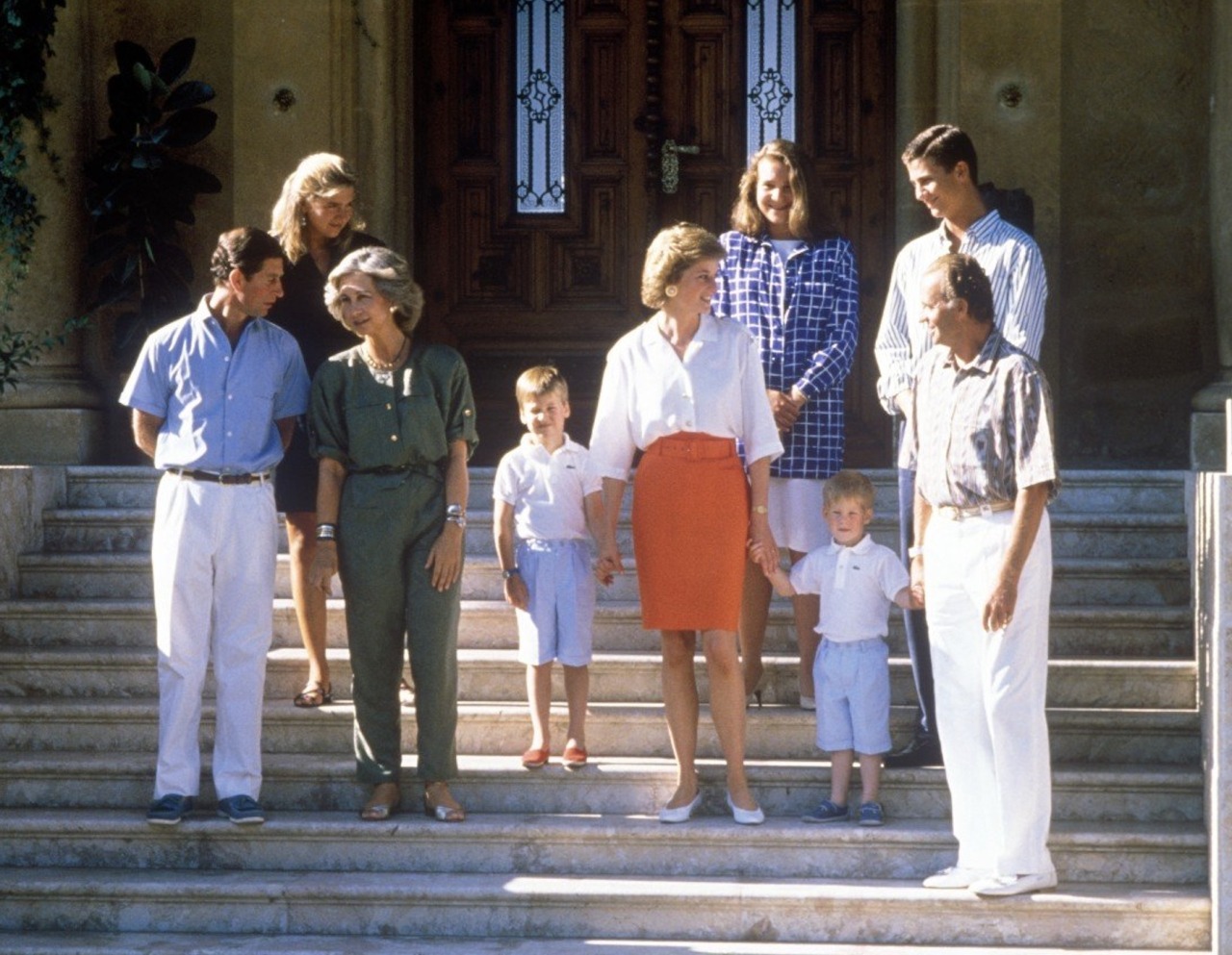 The Prince and Princess of Wales, Prince William, and Prince Harry and King Constantine II, Queen Anne-Marie, Princess Theodora and Prince Philippos of Greece joined King Juan Carlos and Queen Sofia of Spain, with Infanta Elena and Infanta Cristina for a photocall aboard the Spanish Royal Yacht ‘Fortuna‘ in Palma de Mallorca, on the last of their four annual Holidays at the nearby Marivent Palace, the Spanish Royal Summer Residence.