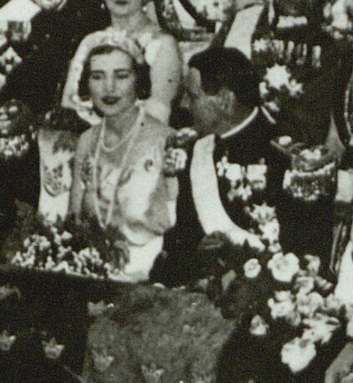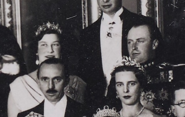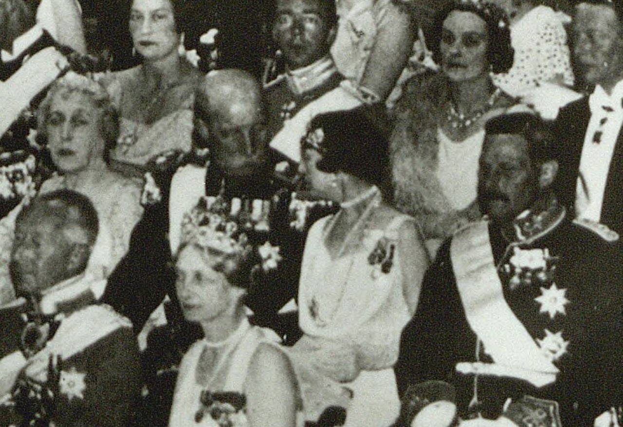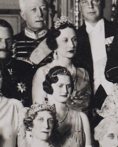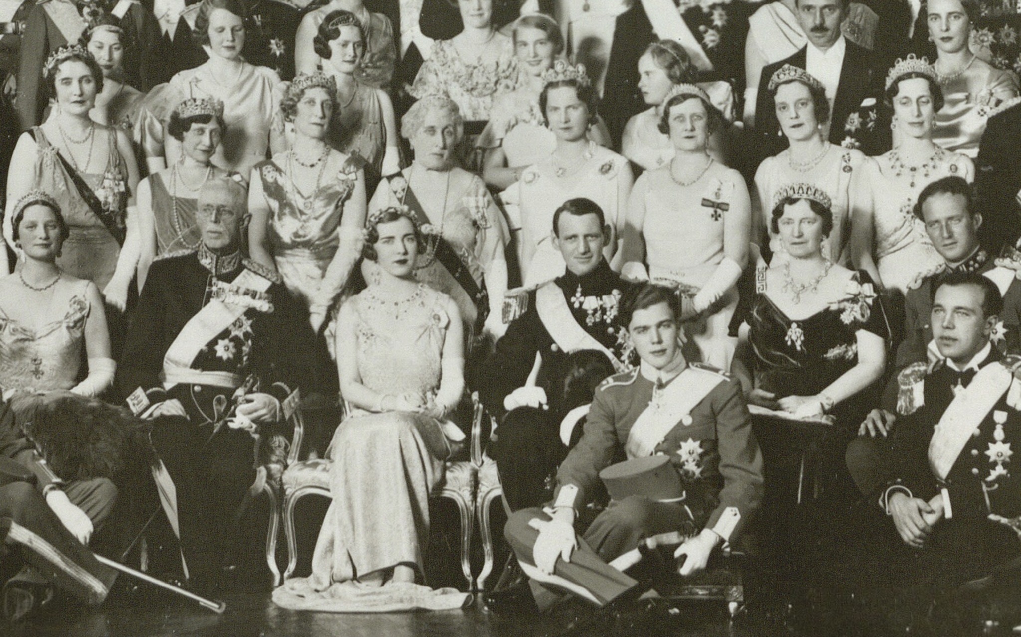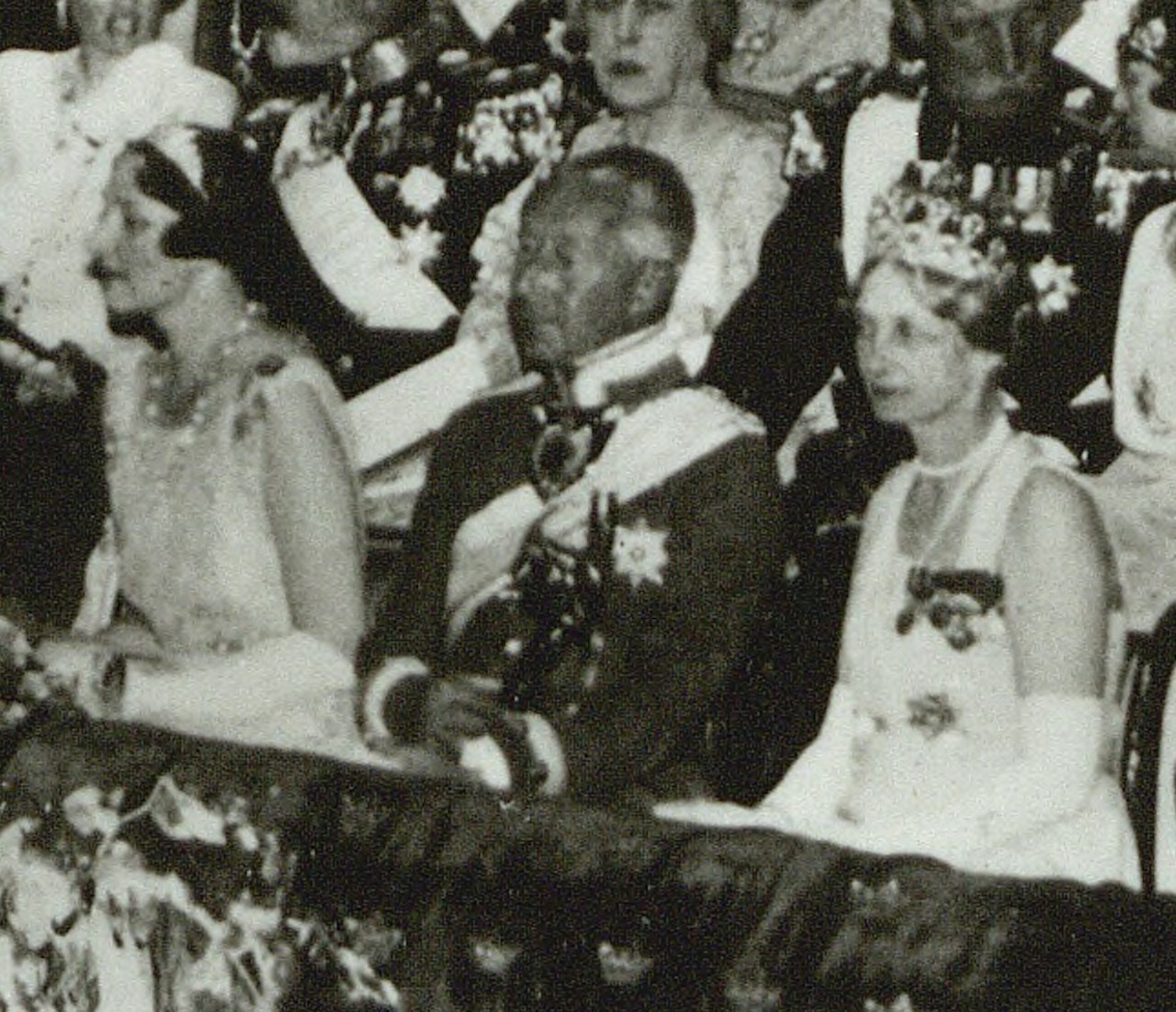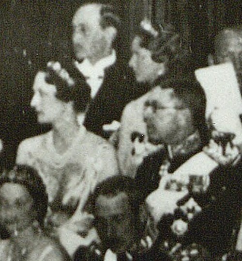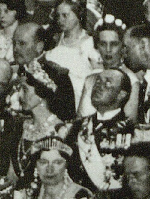 Queen Astrid of Belgium (cousin of the bride and groom, wearing the Nine Provinces Tiara) and King Gustaf V of Sweden (grandfather of the bride)
