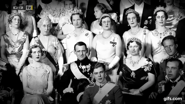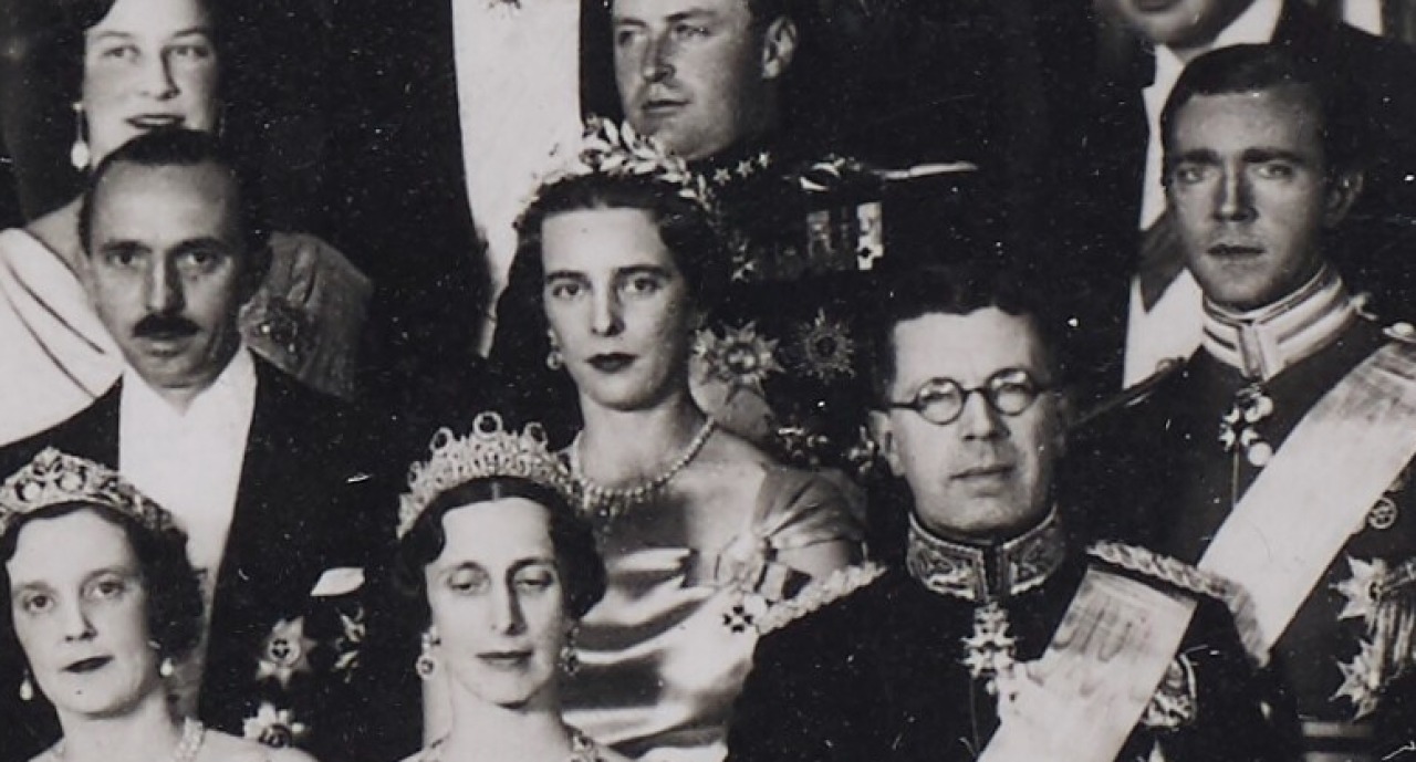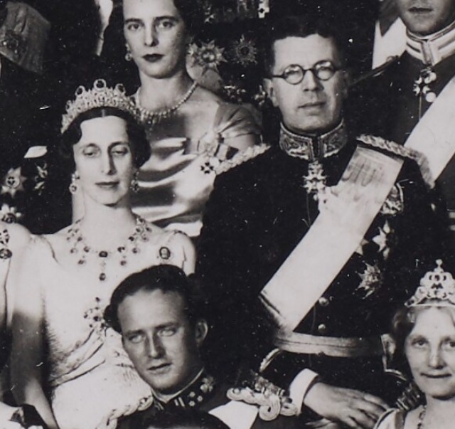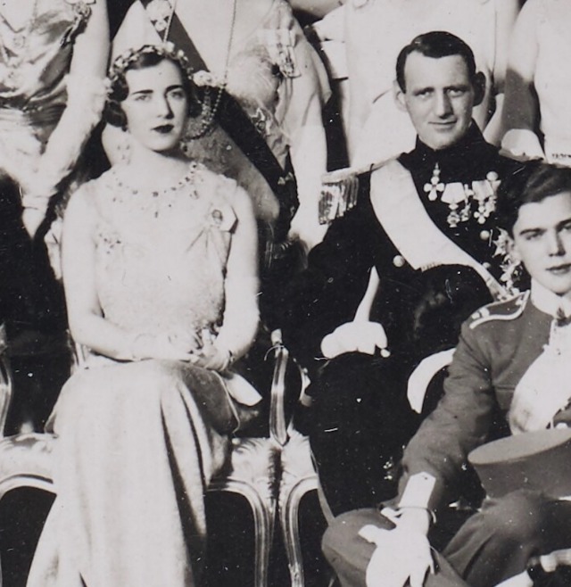 Queen Astrid of Belgium (cousin of the bride and groom, wearing her Emerald Necklace Tiara) and King Christian X of Denmark (father of the groom)