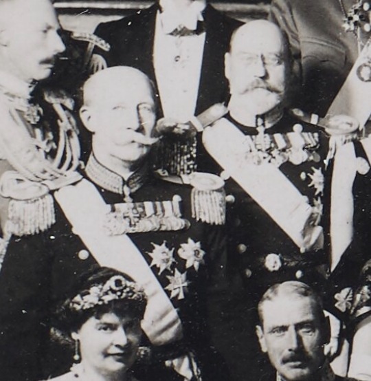 The Grand Duchess of Mecklenburg-Schwerin (aunt of the groom, wearing a Sapphire Tiara and Bolin Sapphire Necklace) and Prince Arthur of Connaught (uncle of the bride)
