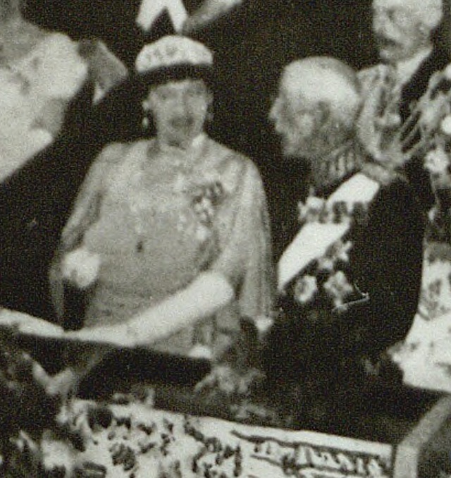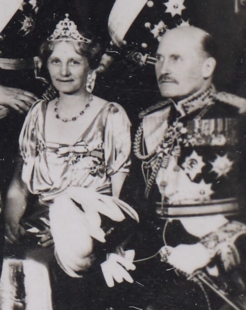Crown Princess Cecilie of Prussia (aunt of the groom, in the Prussian Meander Tiara) and King Gustaf V of Sweden (grandfather of the bride)