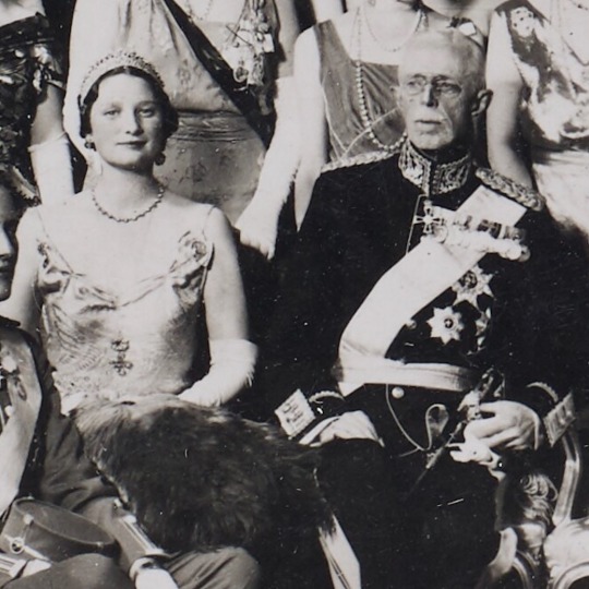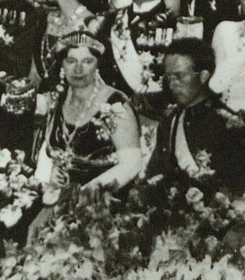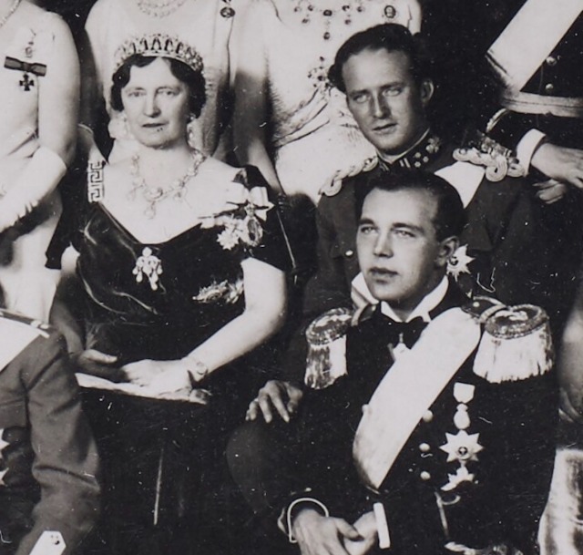 King Christian X of Denmark (father of the groom) and Crown Princess Cecilie of Prussia (aunt of the groom, in the Prussian Sapphire Parure)