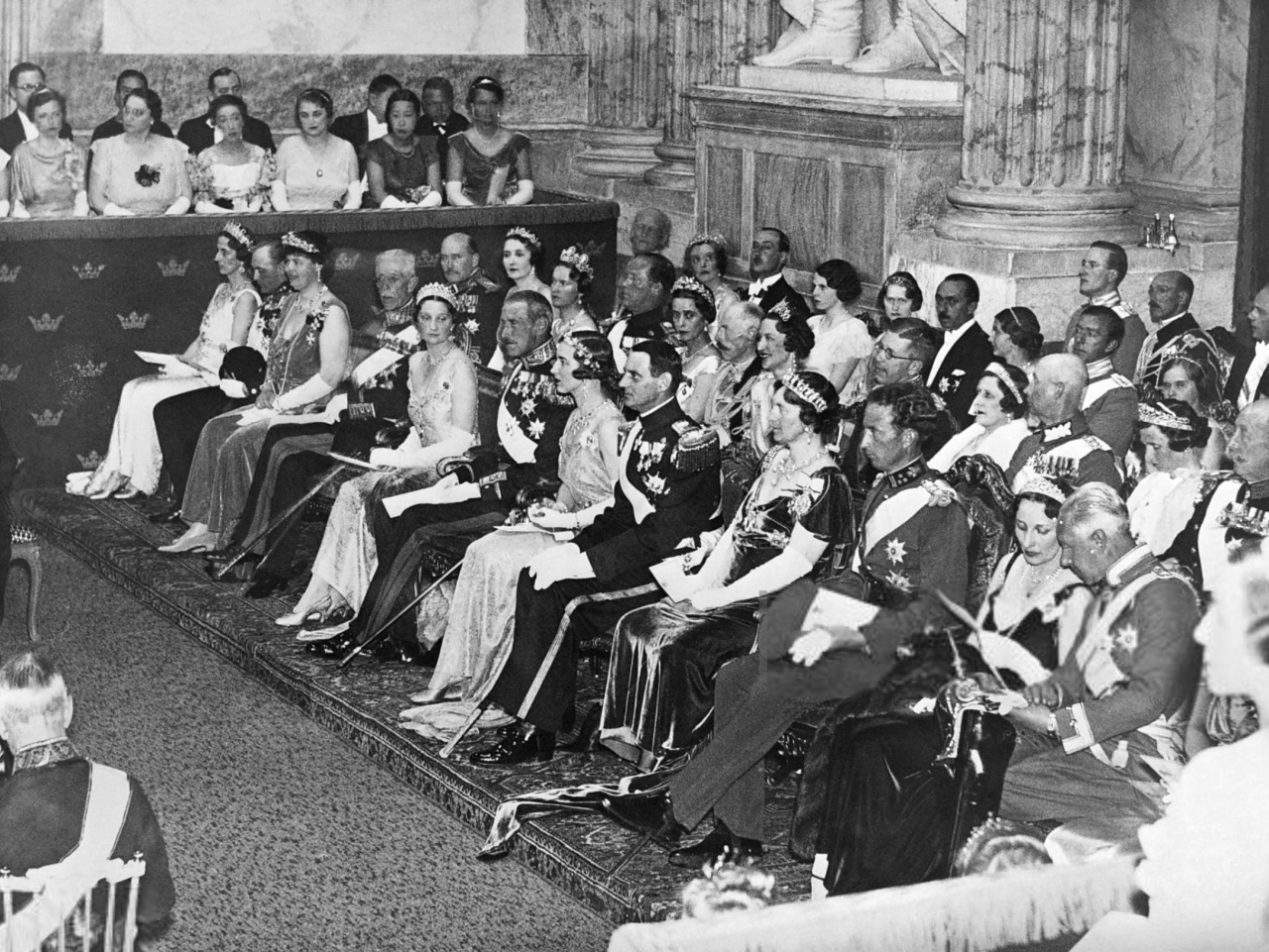 King Gustav V of Sweden, the grandfather of the bride, hosted a Banquet followed by a Concert in the Rikssalen of the Royal Palace of Stockholm two days before the Wedding of Crown Prince Frederik of Denmark and Princess Ingrid of Sweden.