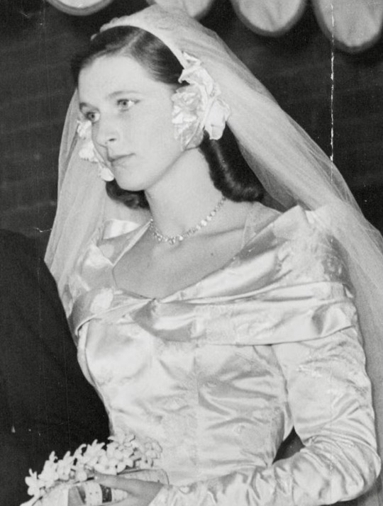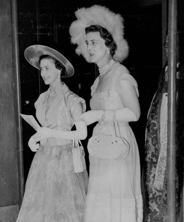 Punctually at 3.30 Queen Mary arrived wearing a heliotrope arrangement: I was immensely struck by her youthful appearance, erect carriage and smiling manner – and her memory. I tried to take her up to the library, as had been arranged, but she insisted on seeing the dining room. First she inspected my Meissen and catching a glimpse of Diana Cooper, who had darted behind a door in the morning room, she said gruffly but humorously: ‘Who is hiding behind that door?’ and when I told her she commanded me to fetch Diana …. They talked of old days. After a bit the bride and bridegroom arrived and were presented, and then I went to the door to meet the King and Queen and Princess Margaret. The King chatted for a moment, but had to leave, and I escorted the immense but cool and airy and smiling Queen into the house, followed by Princess Margaret and in a moment the Duchess of Kent, very elegant, arrived. Then the Baths (who had got to the church, it appears – St Peter’s, Eaton Square – after the King and Queen). Somehow we managed to get the royal family upstairs and the small attendants (the little Astor boy, Chiquita’s, was the prettiest) were collected and photographs were taken.