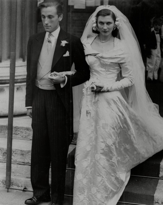 The Royal Family led High Society at the Wedding of David Somerset, the Heir of the Duke of Beaufort, and Lady Caroline Thynne, daughter of the Marquess of Bath, at St Peter’s Church in Eaton Square on this Day in 1950, 75 years ago, before a Reception for 1,000 at the home of Sir ‘Chips’ Channon in Belgrave Square!