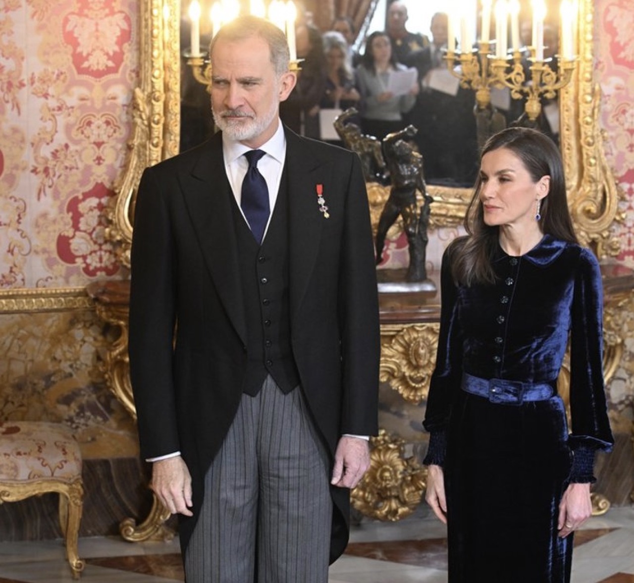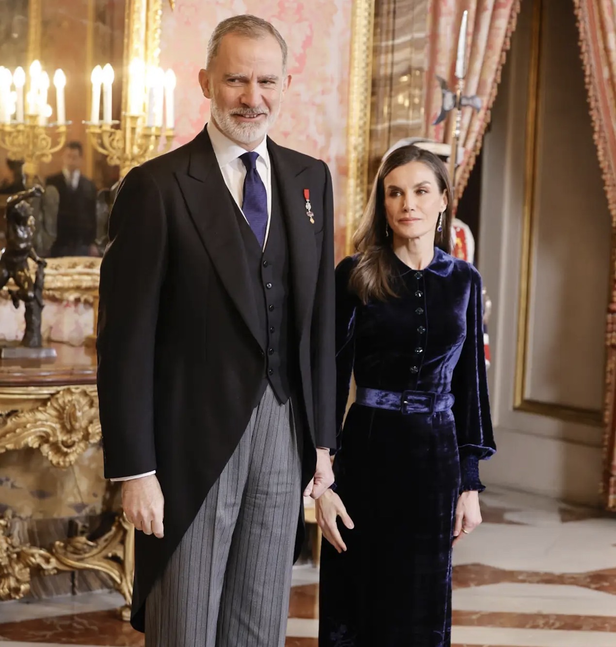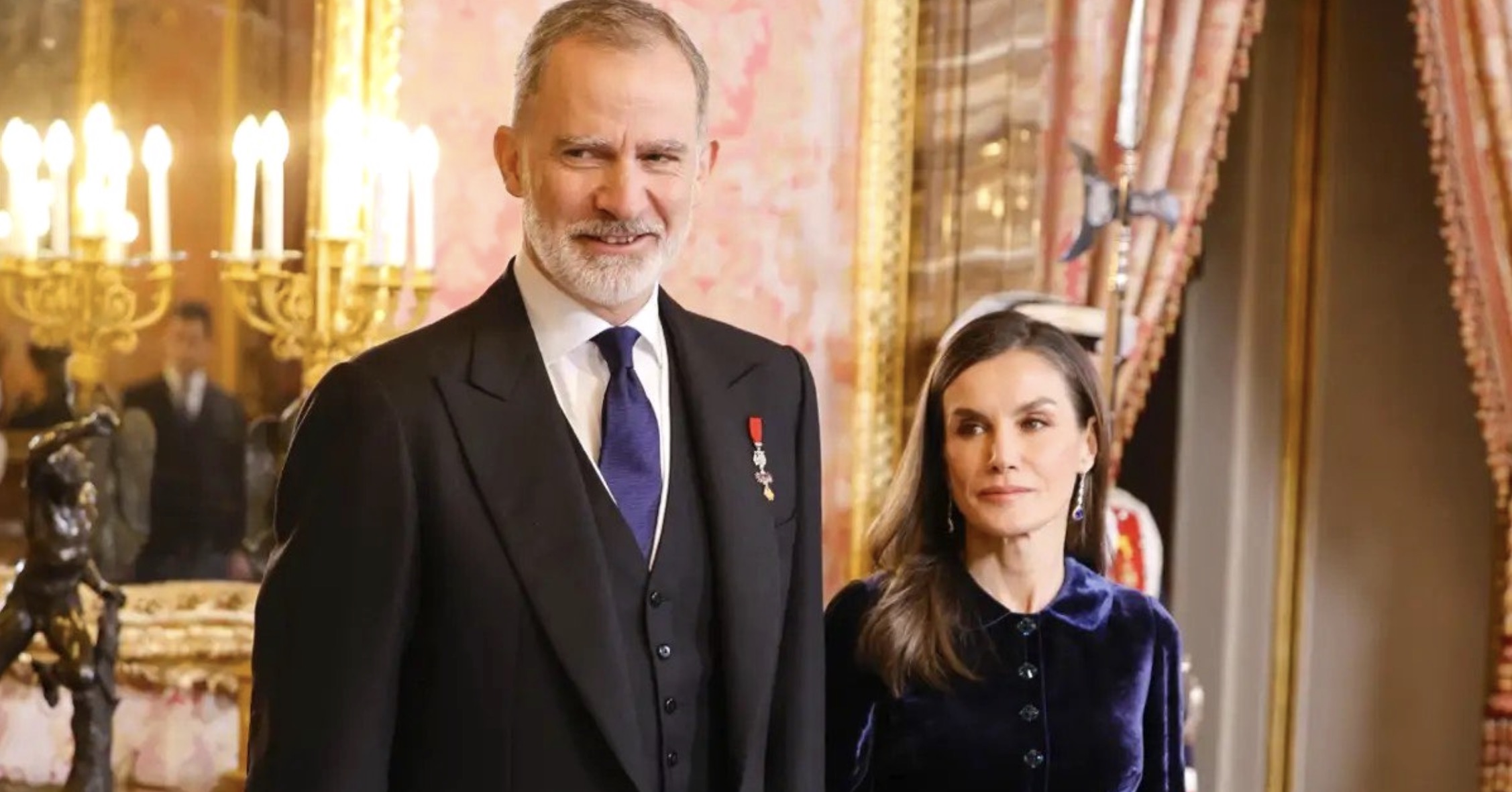 King Felipe wore the badge of the Order of the Golden Fleece while Queen Letizia wore her Sapphire Drop Earrings.