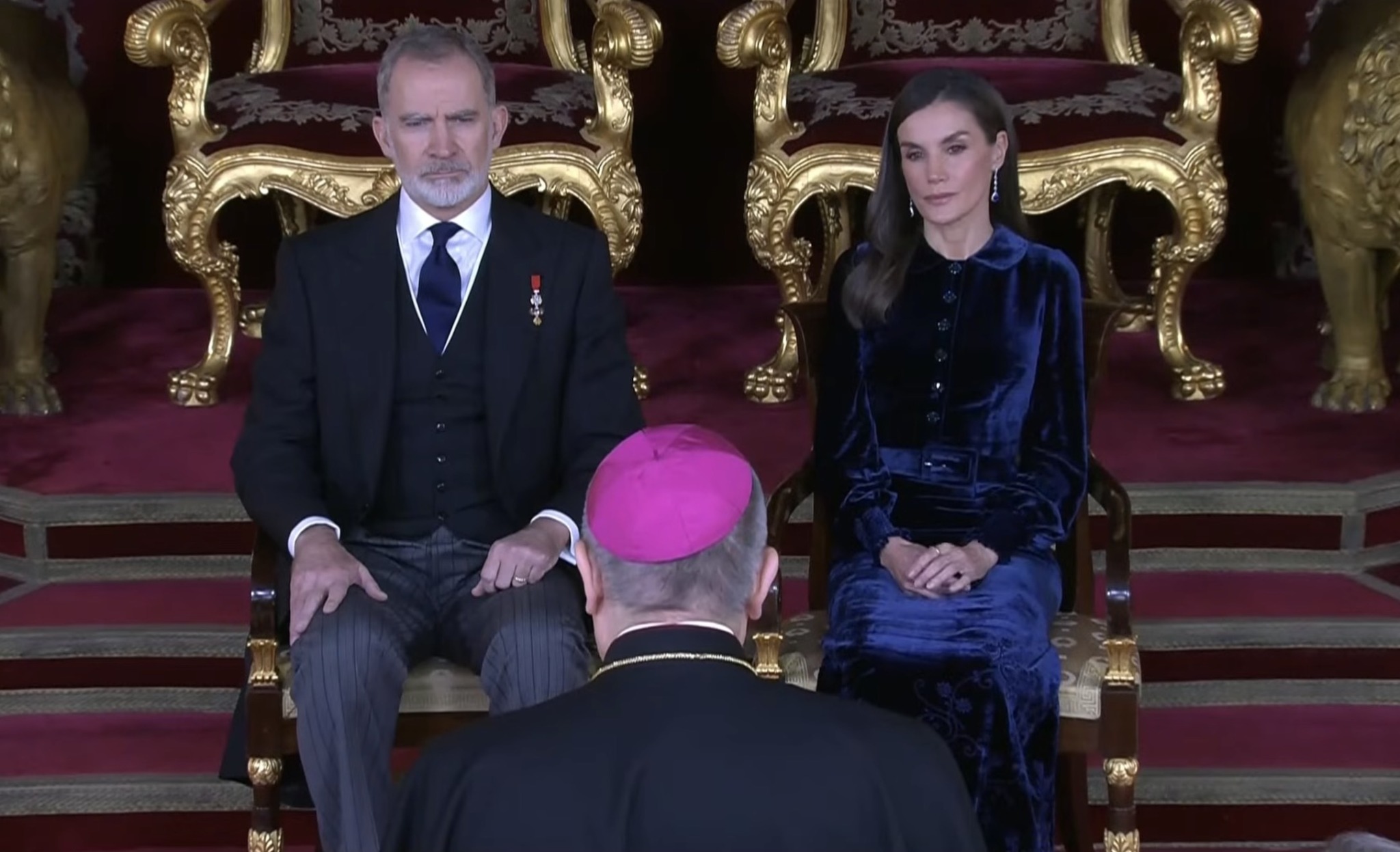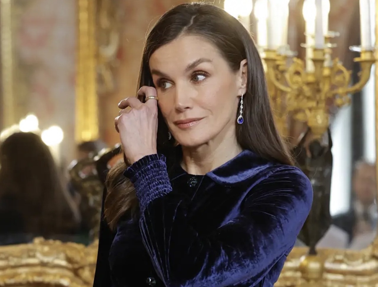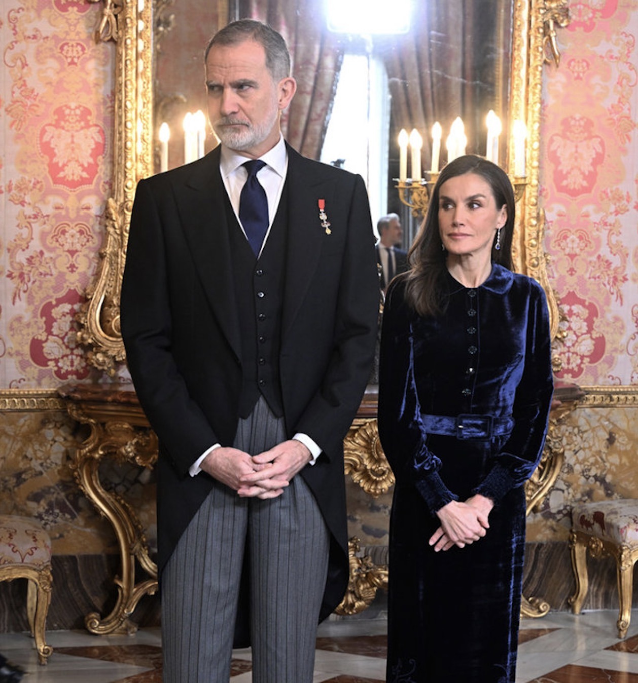 King Felipe wore the badge of the Order of the Golden Fleece while Queen Letizia wore her Sapphire Drop Earrings.