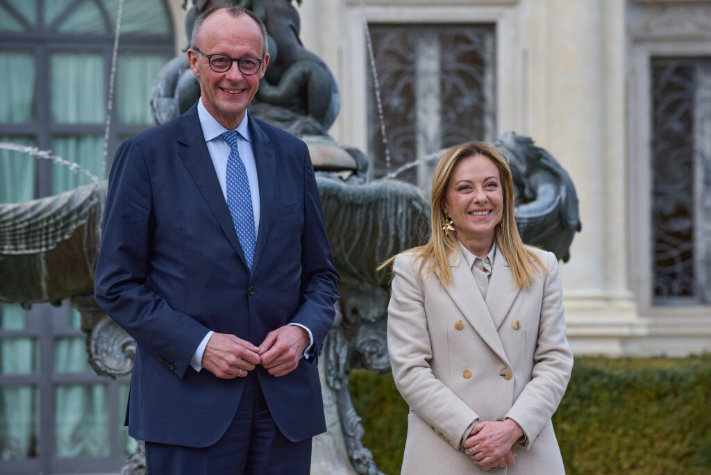 Italian Prime Minister Giorgia Meloni and German Federal Chancellor Friedrich Merz attend the Italy-Germany Intergovernmental Summit at Villa Doria Pamphilj. | Vincenzo Nuzzolese/LightRocket via Getty Images