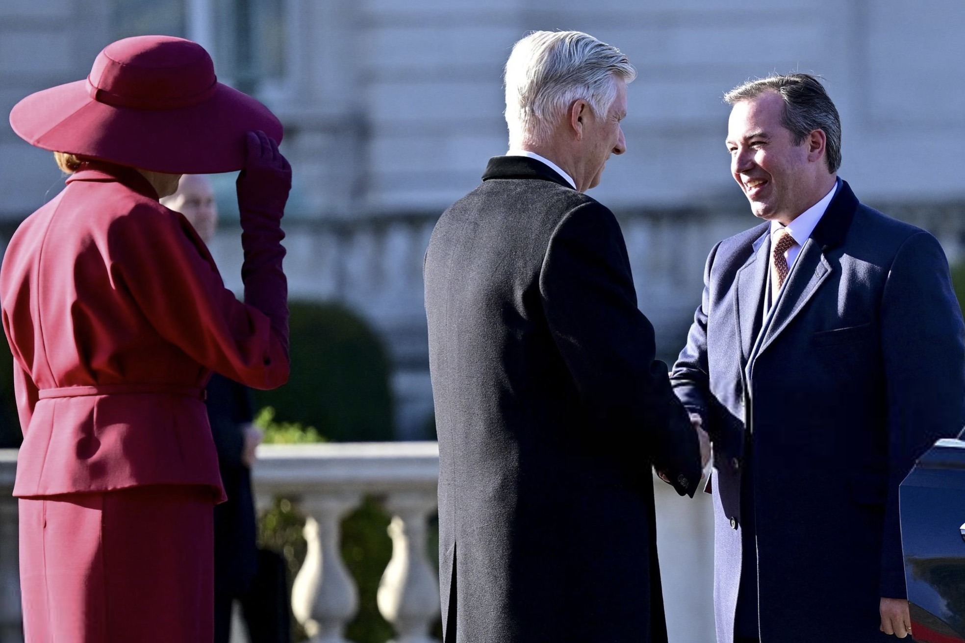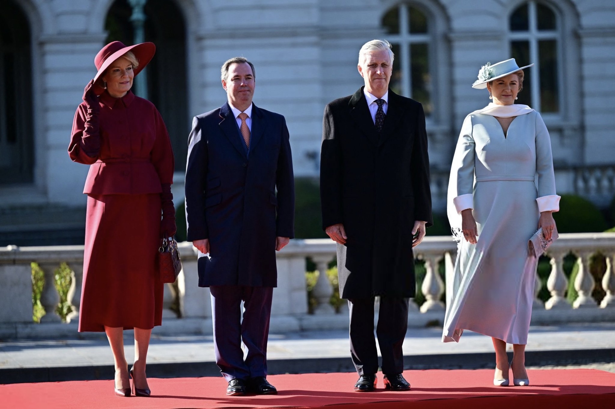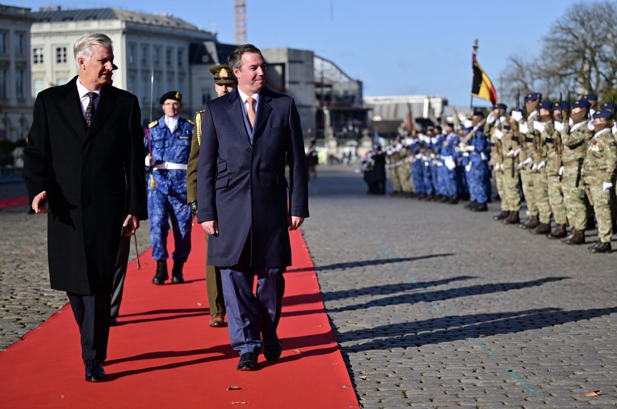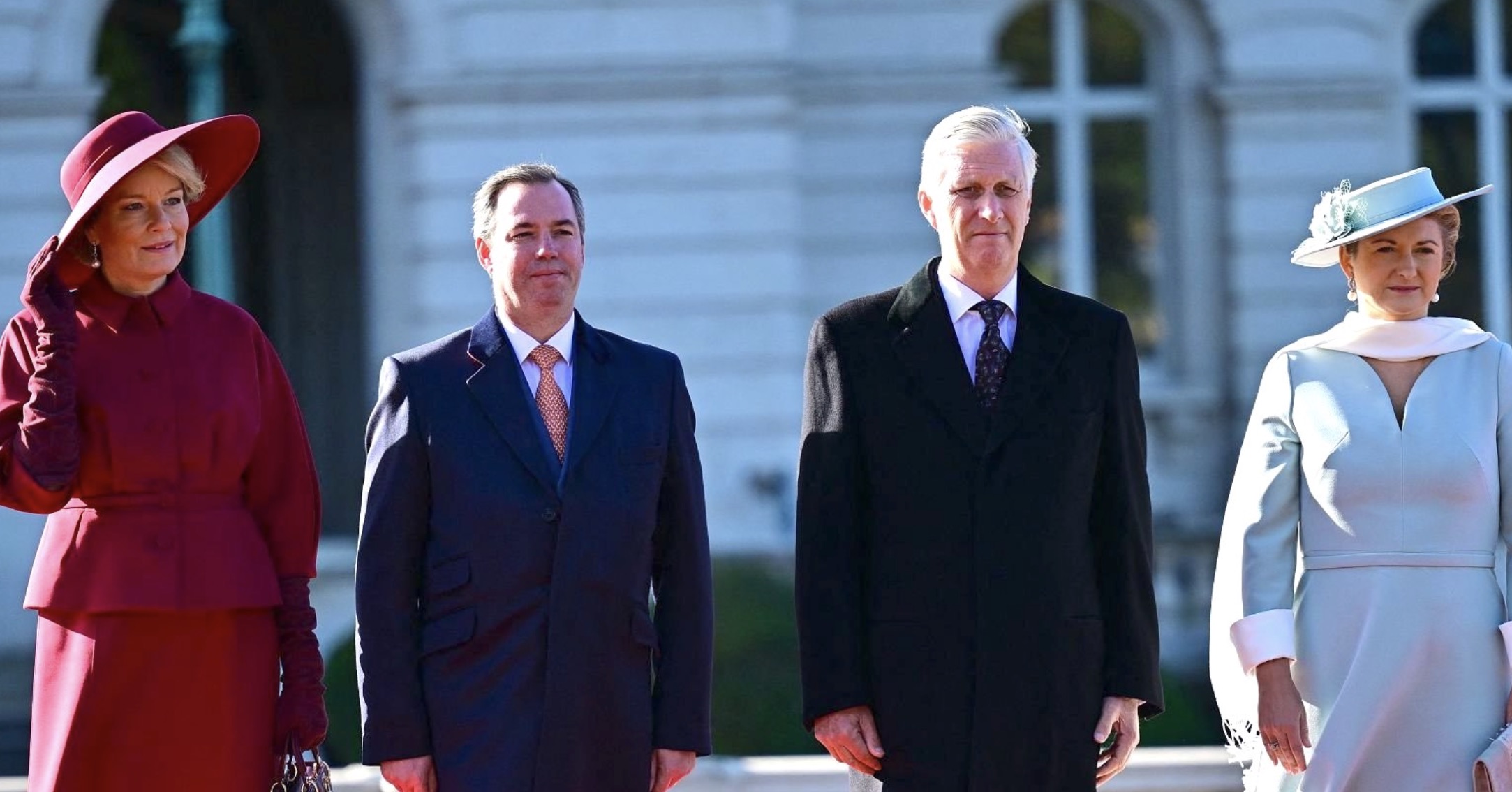 Grand Duke Guillaume and Grand Duchess Stéphanie were received by King Philippe and Queen Mathilde in an Official Welcome Ceremony outside the Royal Palace in Brussels that included a review of the Guard of Honour, and was followed by a Lunch inside the Royal Palace.