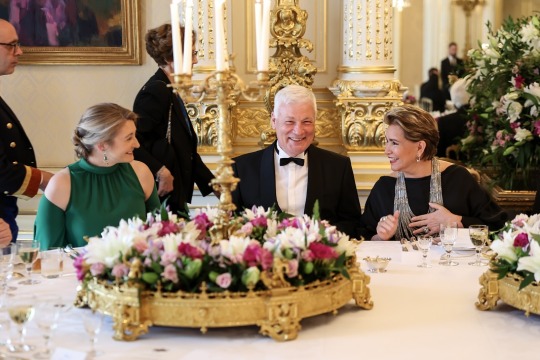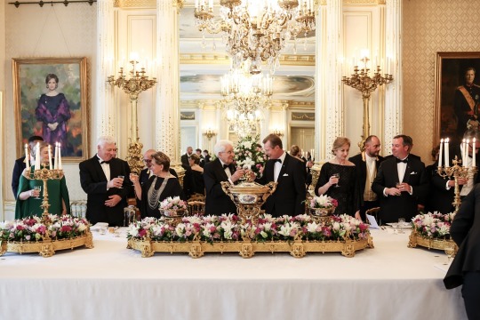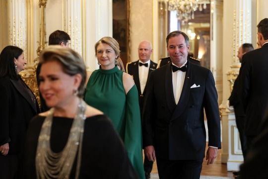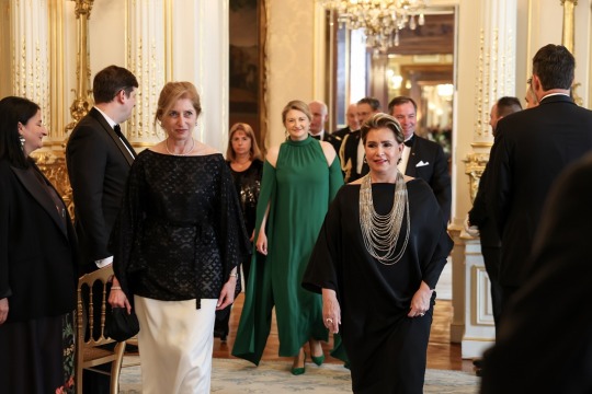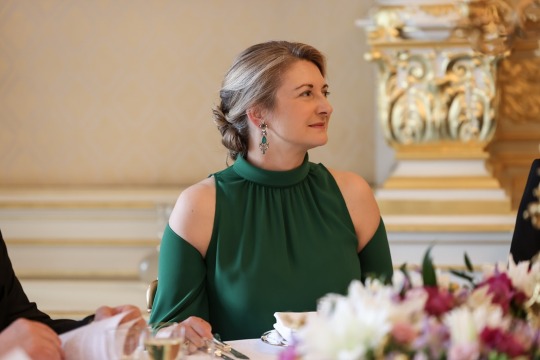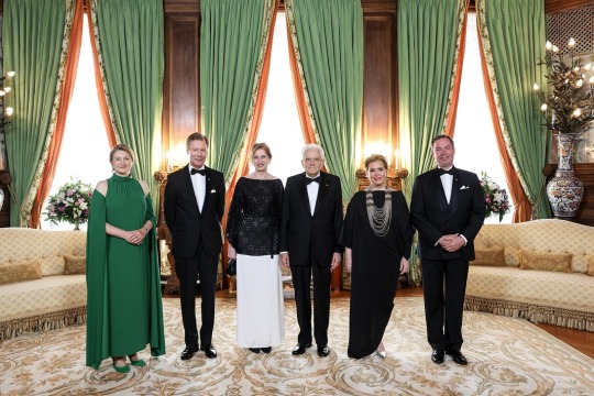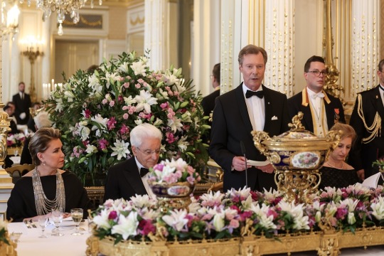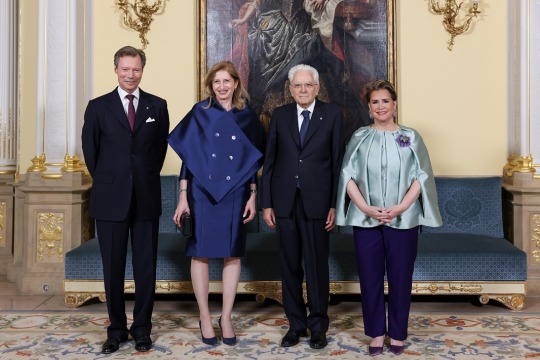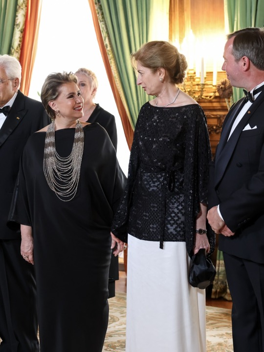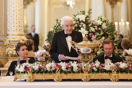 In the evening, Grand Duke Henri and Grand Duchess Maria Teresa were joined by Hereditary Grand Duke Guillaume and Hereditary Grand Duchess Stéphanie (wearing the Antique Emerald Earrings) as they hosted a Gala Dinner for President Sergio Mattarella and Laura Mattarella at the Grand Ducal Palace.