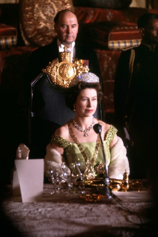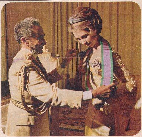 Our first evening was marked by a state banquet. While we were dressing for dinner, the Prime Minister arrived at our bedroom door with an Order for me from the Emperor – the Badge and Star of the Queen of Sheba – and said he must pin it on me personally. As I was only half-dressed this was out of the question; however he insisted till my maid, after a heated argument, somehow chivvied him into handing it over in the ru. sage. He retired disgruntled. The banquet proved a magnificent spectacle, with ninety-nine guests eating off a service of silver gilt from Aspreys – the food presented by footmen dressed in green jackets, maroon velvet breeches and white stockings.