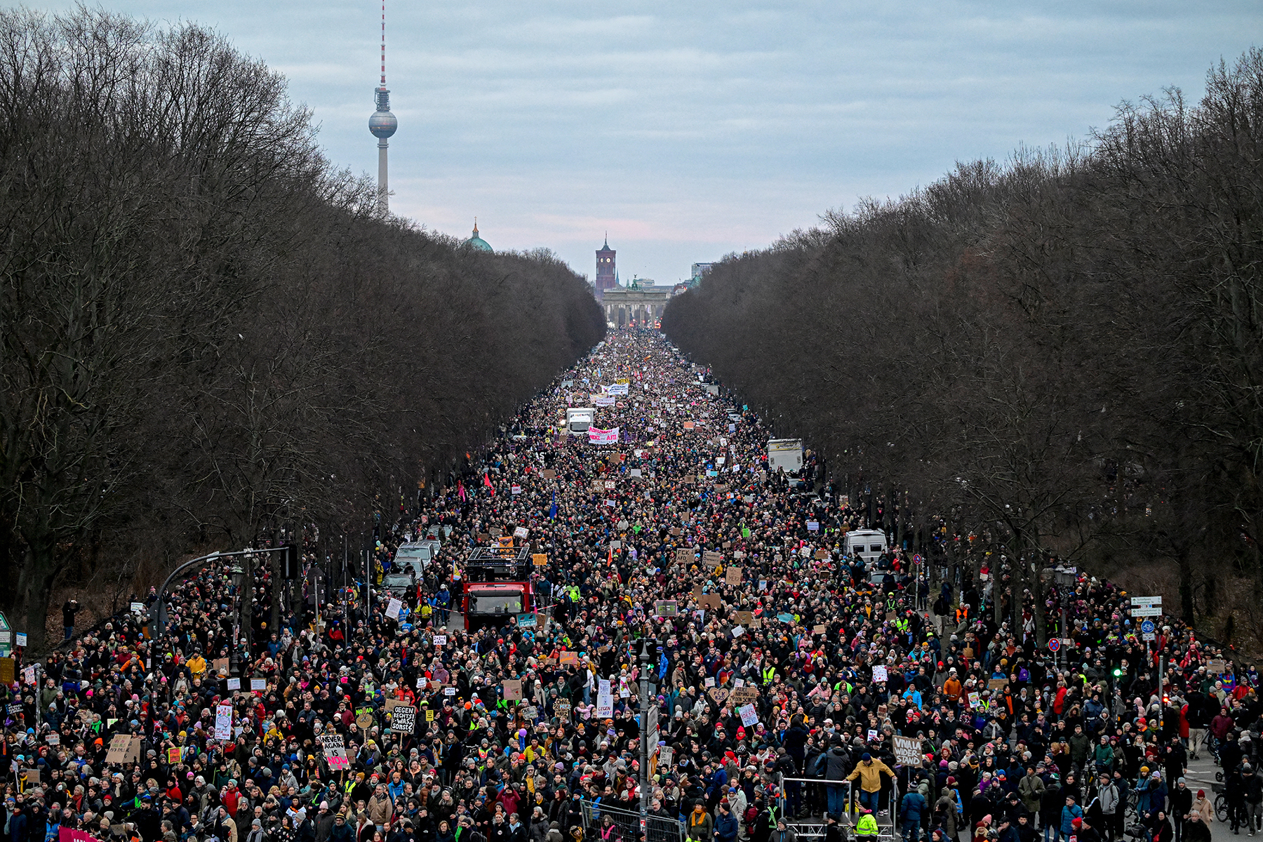 Protesters demostrate under the motto “Loud against Nazis” in early February in Berlin. After years of decline, The Left party  pulled off a stunning revival in the general election later that month. | John MacDougall via AFP/Getty Images