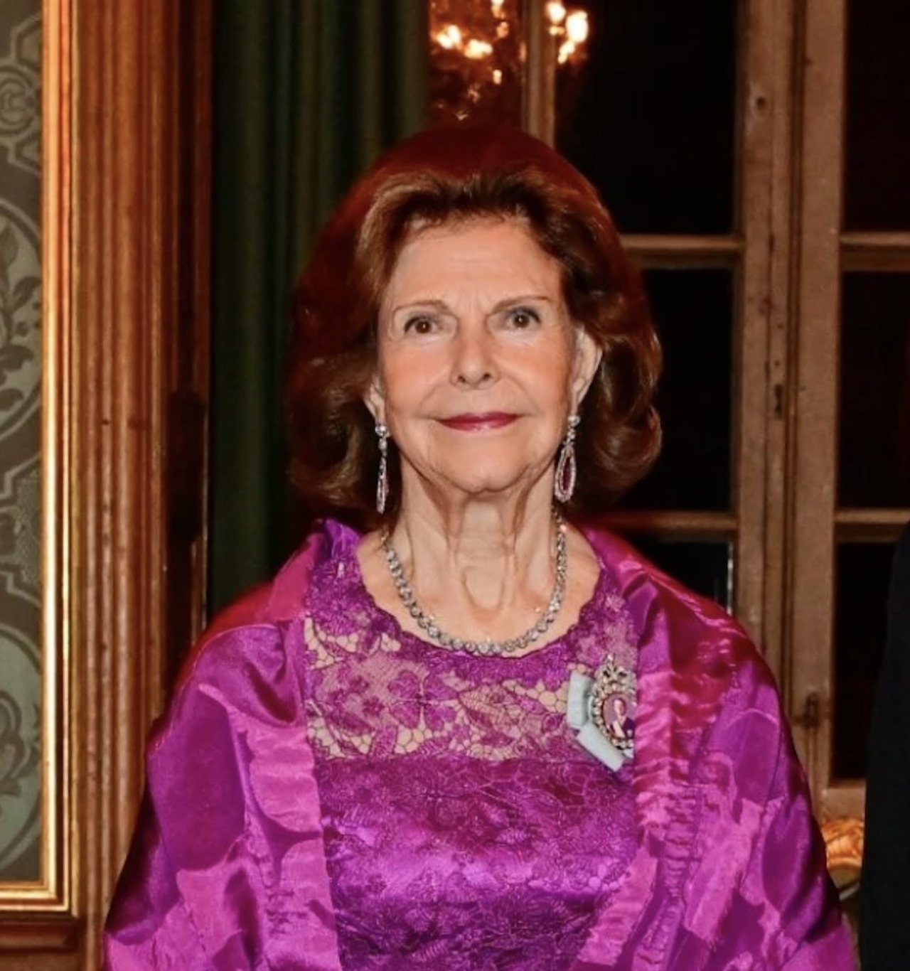 Queen Silvia wore the Pink Topaz Earrings with King Carl XVI Gustaf’s Portrait Brooch.