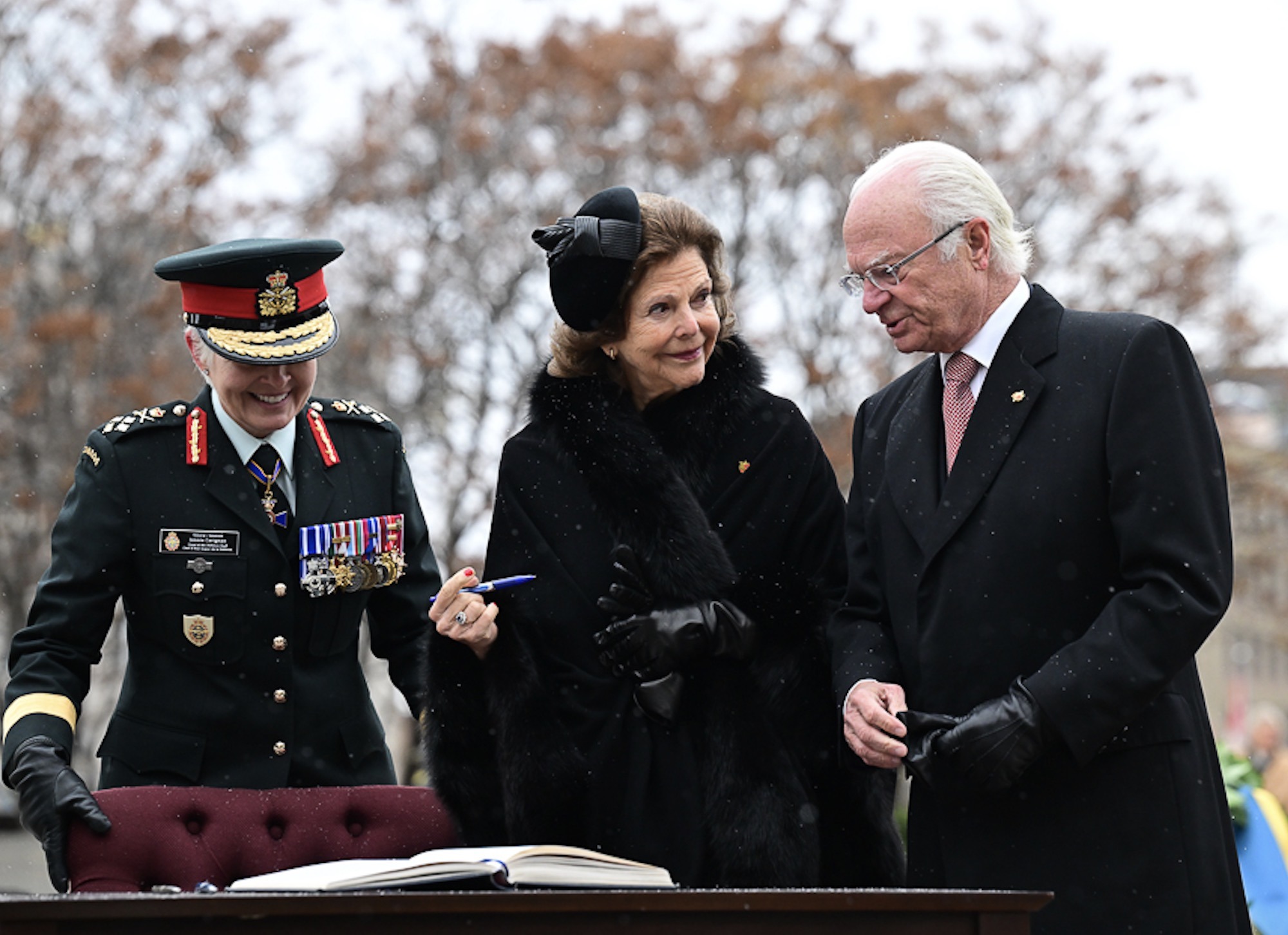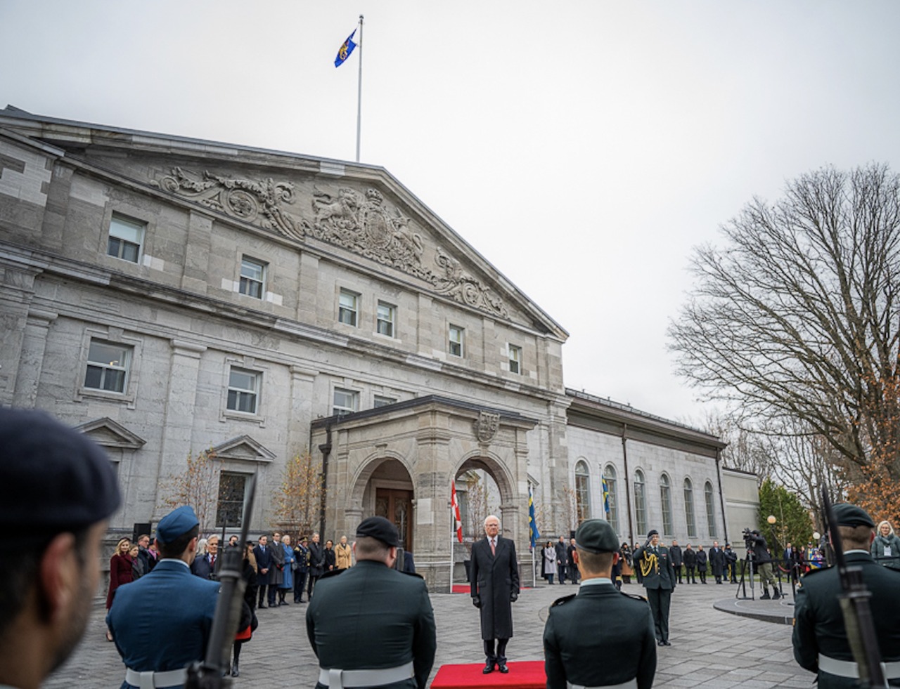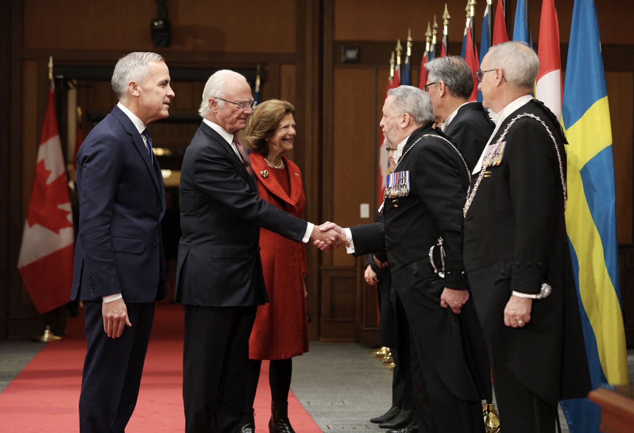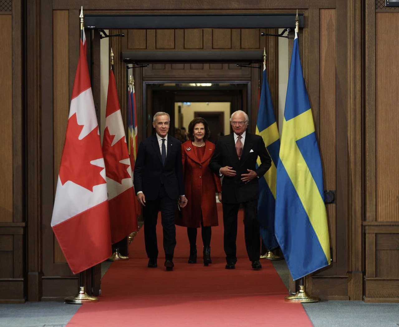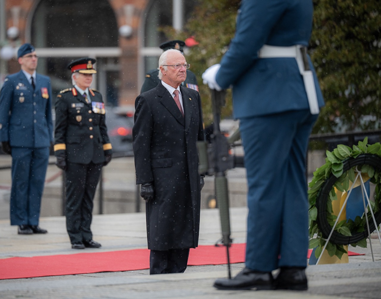 King Carl XVI Gustaf and Queen Silvia were received by Chief Justice Richard Wagner in an Official Welcoming Ceremony at Rideau Hall, with a military guard of honour, followed by a wreath-laying at the National War Memorial, before visiting the Parliament of Canada. The Governor General is currently hospitalised so has been replaced by the Chief Justice of the Supreme Court of Canada, Richard Wagner.