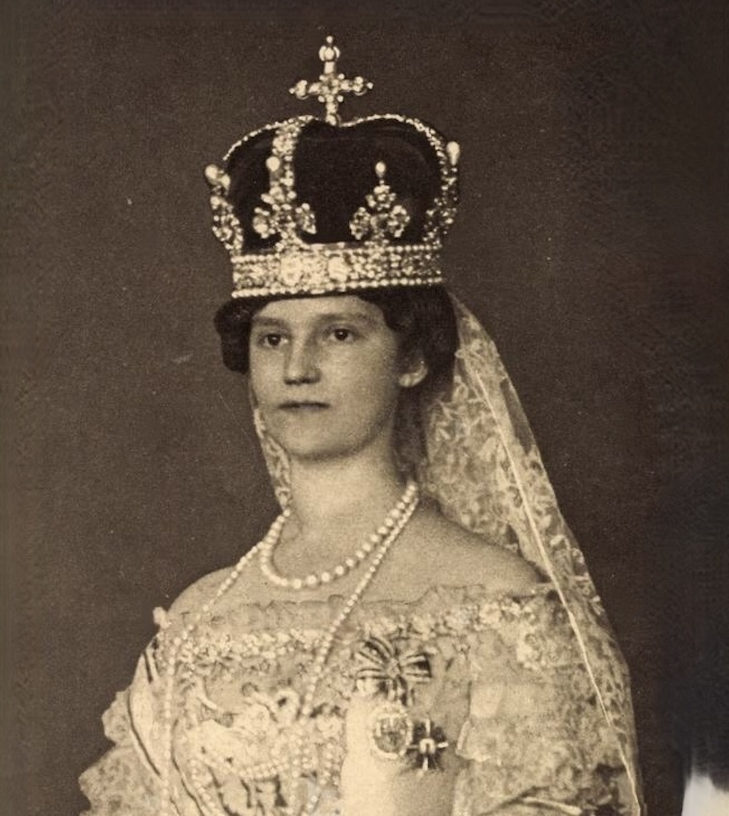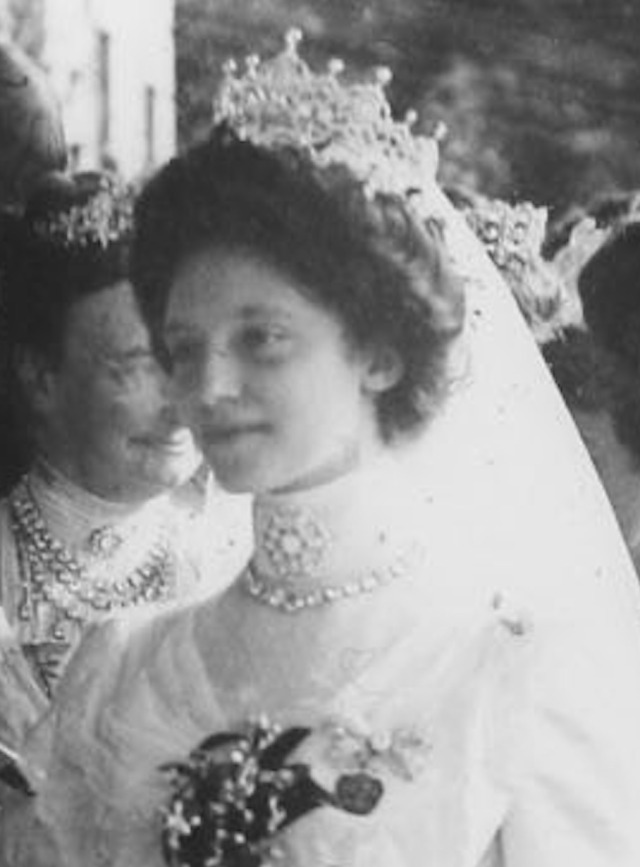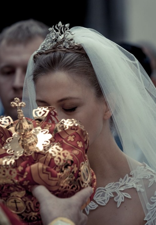 The crowning glory was her grandmother Archduchess Anna Maria Gabriela of Austria’s tiara, carried on a plane with her from Belgium. Equally for aesthetics and security purposes, the tiara was woven into a braid atop Tatiana’s head.