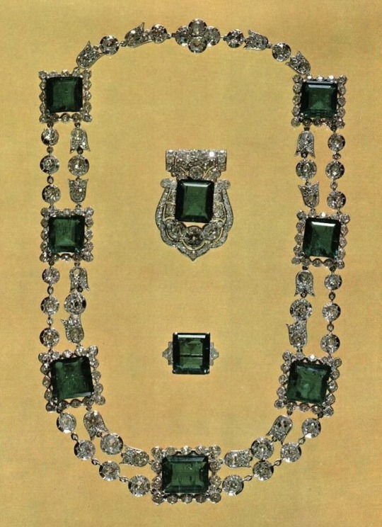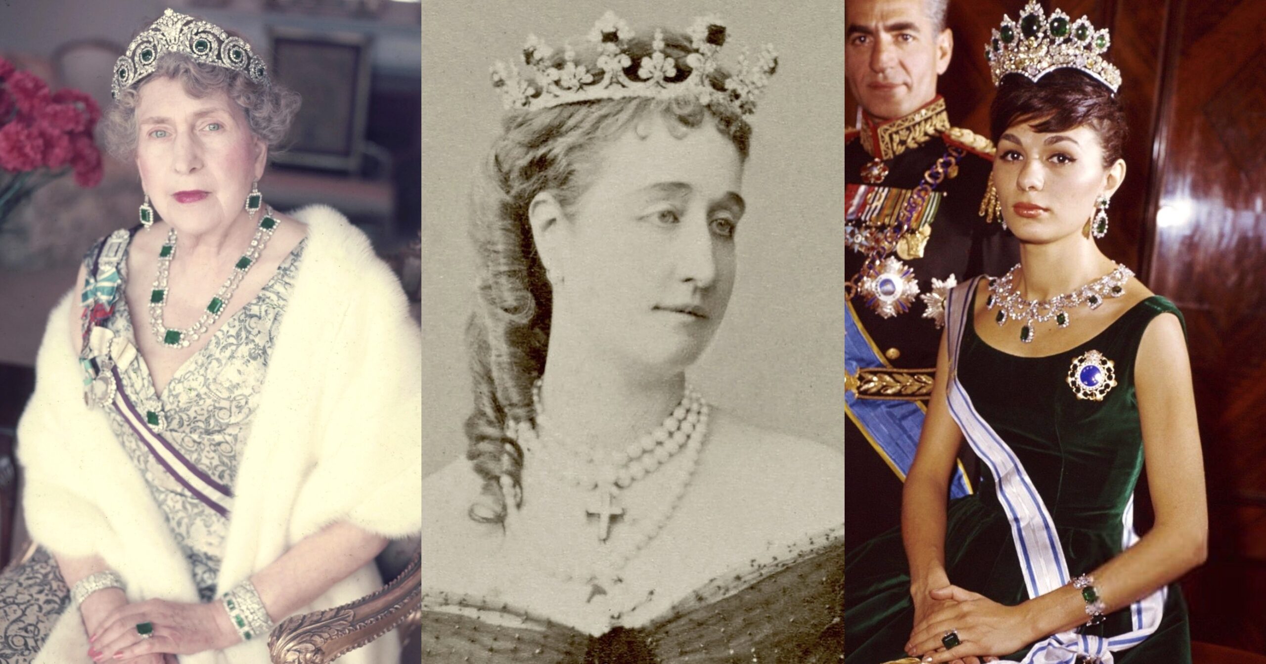 Queen Victoria Eugenie’s Cartier Emerald Necklace was bought by Cartier at the Auction, and some of the emeralds were reset into an Emerald and Diamond Bracelet that was sold to Shah Muhammad Reza Pahlavi of Iran and worn by Empress Farah with her Seven Emerald Tiara, alongside a massive Diamond and Emerald Necklace that has been said to also contain Empress Eugénie’s Emeralds, but had been worn since 1960, before Queen Victoria Eugenie put her Emerald up for sale.