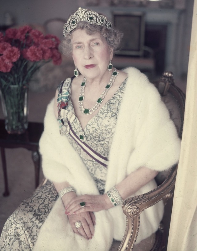 Eventually, Empress Eugénie’s Emeralds were reset by Cartier into a two-row diamond setting, along with a brooch and a ring, which were worn by Queen Victoria Eugenie quite frequently even after her exile from Spain in 1931, often worn with the emerald version of her Cartier Diamond and Pearl Tiara, like for the Wedding Ball of Princess Elizabeth and Prince Philip of Greece and Denmark at Buckingham Palace.