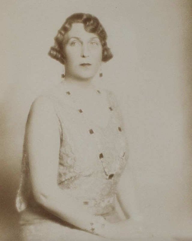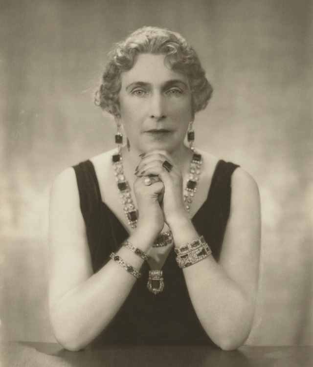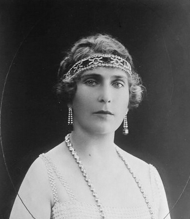 Part of the necklace was also worn as a bandeau. The Queen placed it in between two petite diamond rivières. She was also portrayed by Osterman with this bandeau version circa 1920.