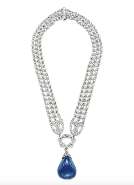 It is thought that the rest of the Sapphire and Diamond Necklace is still in existence in Germany, but some believe that the cabochon drop-shaped sapphire pendant signed Cartier Paris was sold with an later made seed pearl sautoir at Christie’s Geneva, in 1993 and most recently in Geneva in 2012 for CHF 159,00.