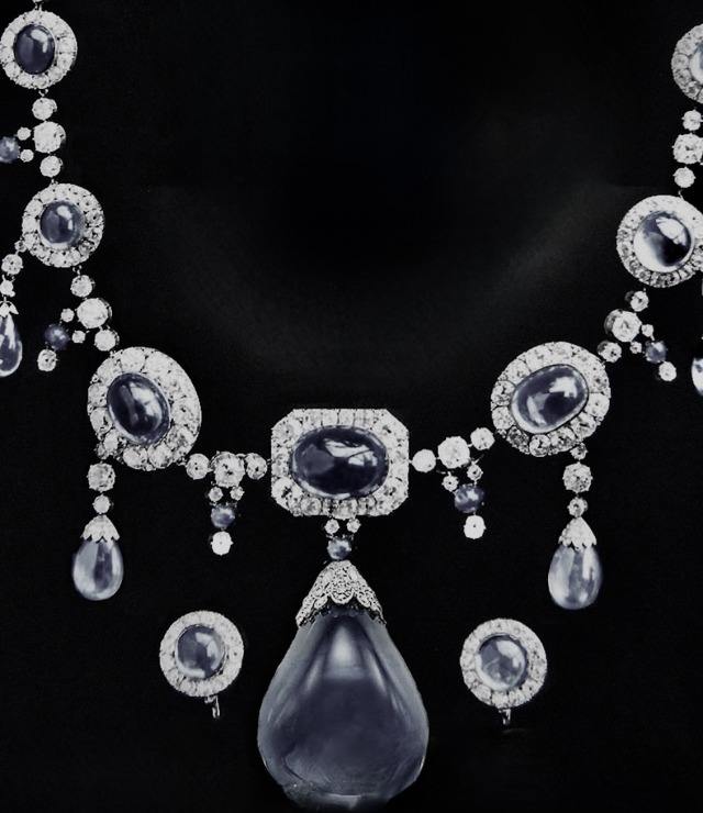 When Duchess Marie of Mecklenburg-Schwerin married Grand Duke Vladimir Alexandrovich of Russia, the third son of Tsar Alexander II of Russia, in 1874, she received numerous spectacular jewels including her Vladimir Tiara, Diamond Fringe Tiara, Diamond Rivière, Emerald Necklace and several sapphire jewels which reportedly originated from Empress Alexandra Feodorovna, including this spectacular necklace highlighted with a massive cabochon drop-shaped sapphire alongside pear-shaped and cabochon sapphires set within diamonds.
