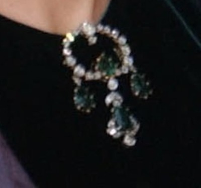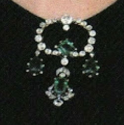 The upper section of the brooch currently features a circular arrangement of 18 diamonds and one emerald. Suspended from this are three drop-shaped emeralds, one of which is set in a more elaborate diamond mount. The design is highly versatile: the brooch can be worn without any pendants, with one, or with two of the drops attached. Additionally, two of the emerald drops are frequently worn separately as earrings, further demonstrating the multifunctional nature of the piece.